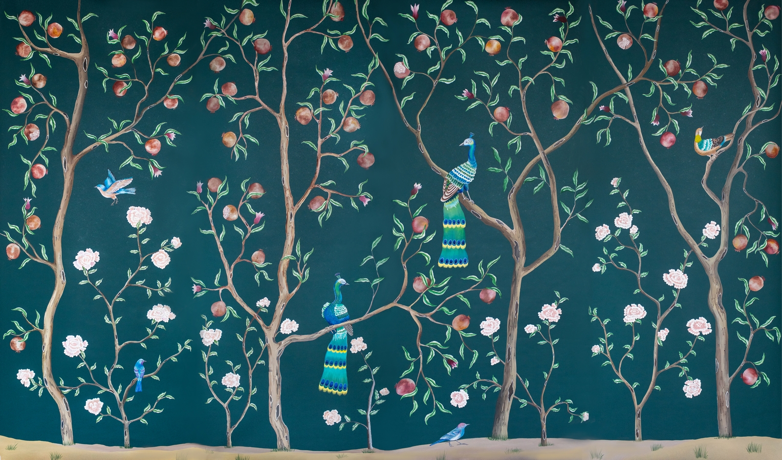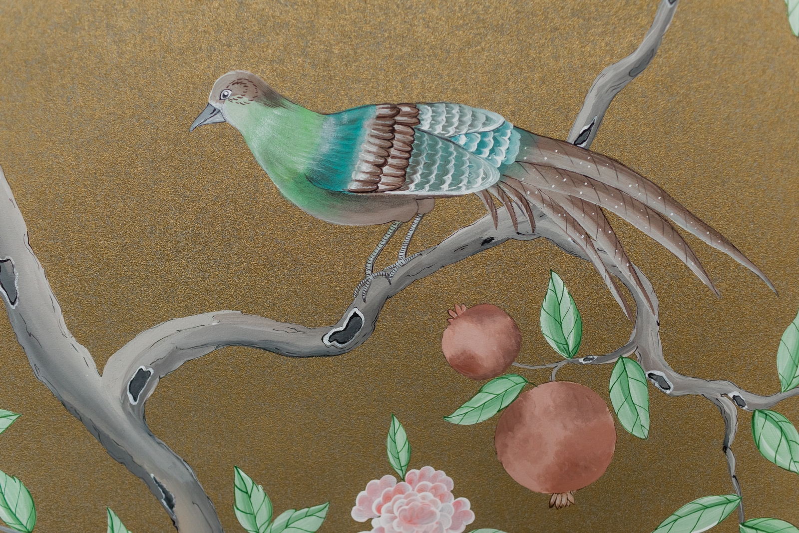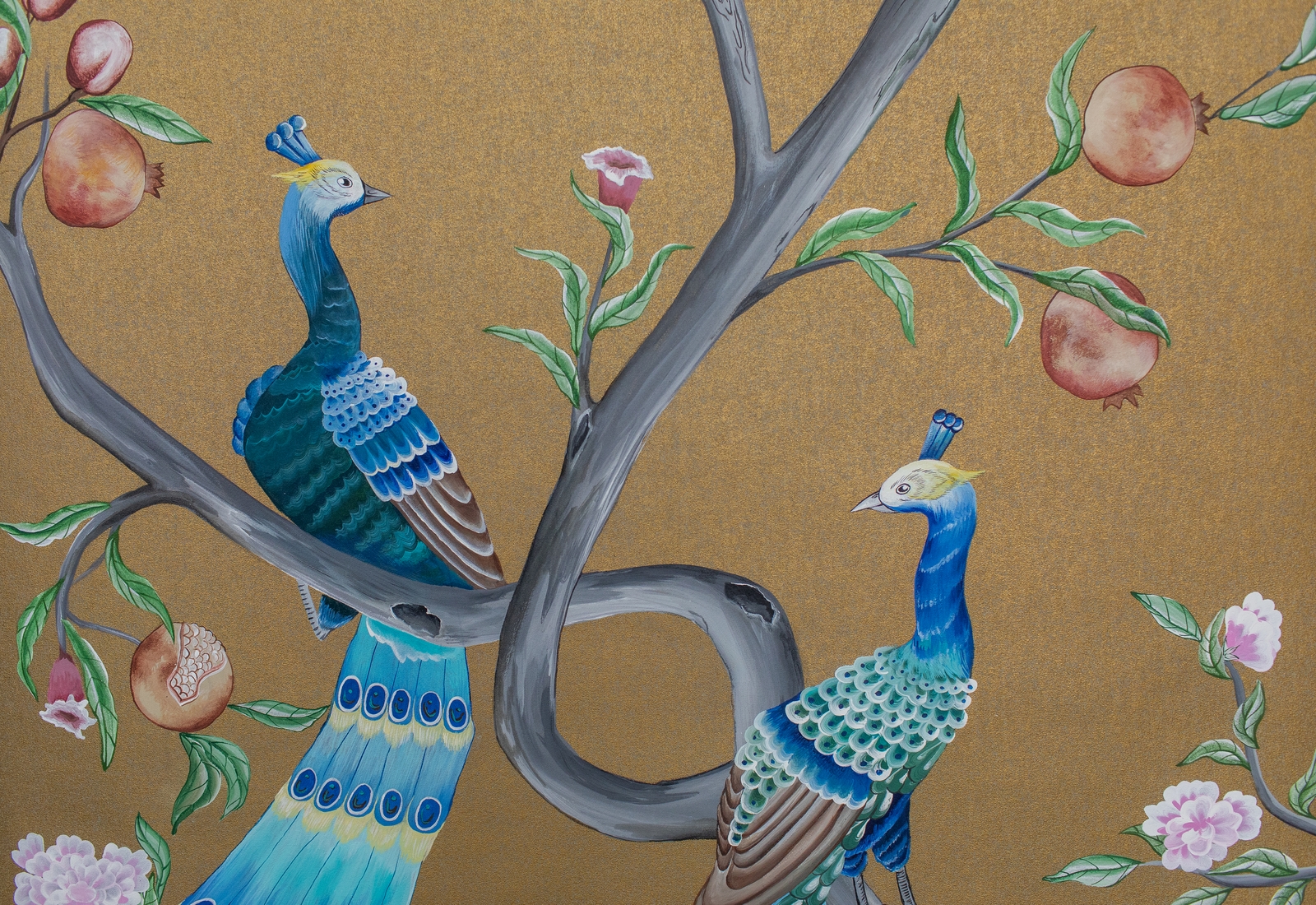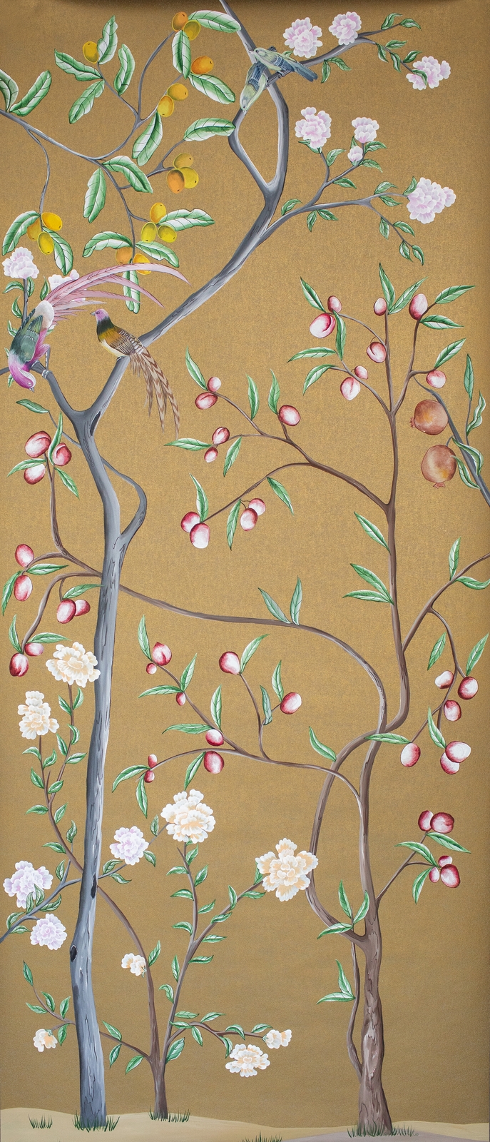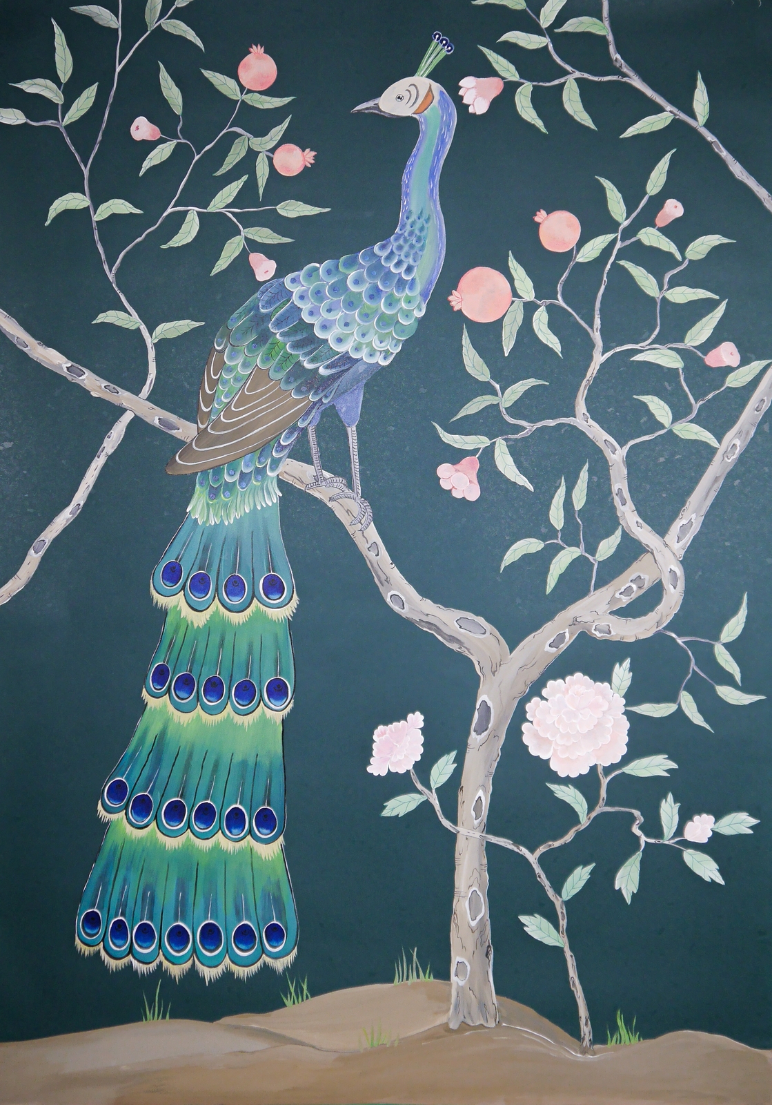 Pfauen in Granatapfelbäumen, inspiriert von einem Original aus der Qing Dynastie. Das Paneel-Set besteht aus drei Paneelen, das Tapeten-Set aus vier Tapetenstreifen.