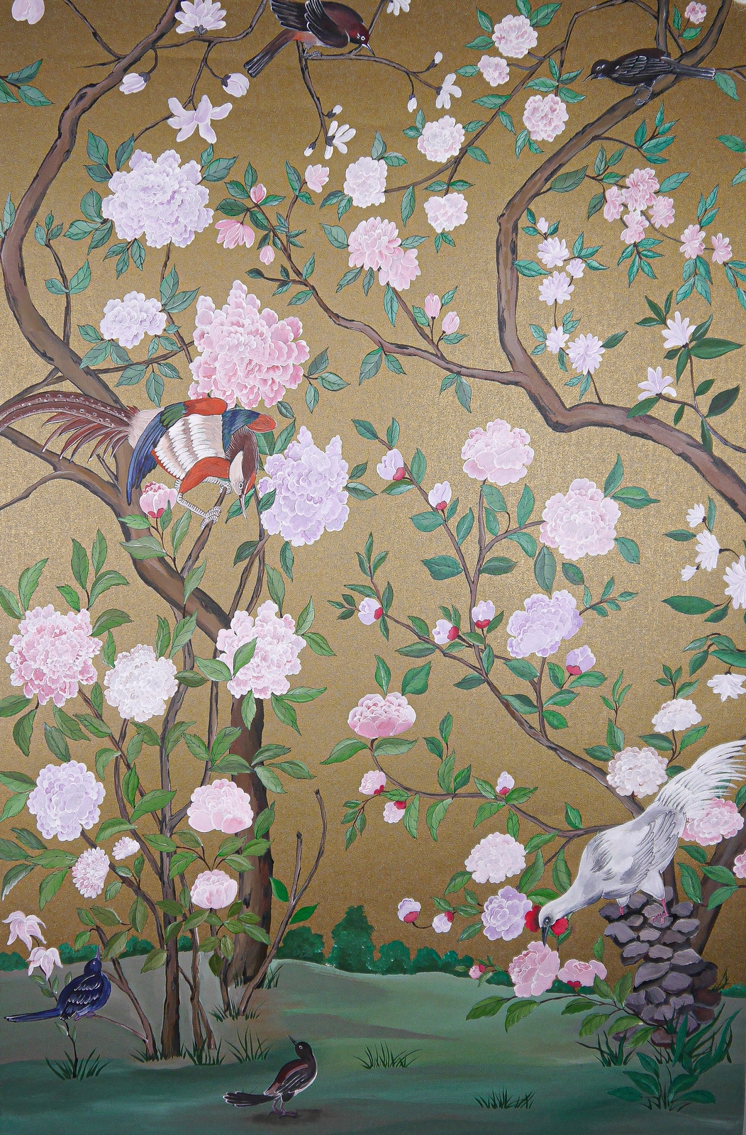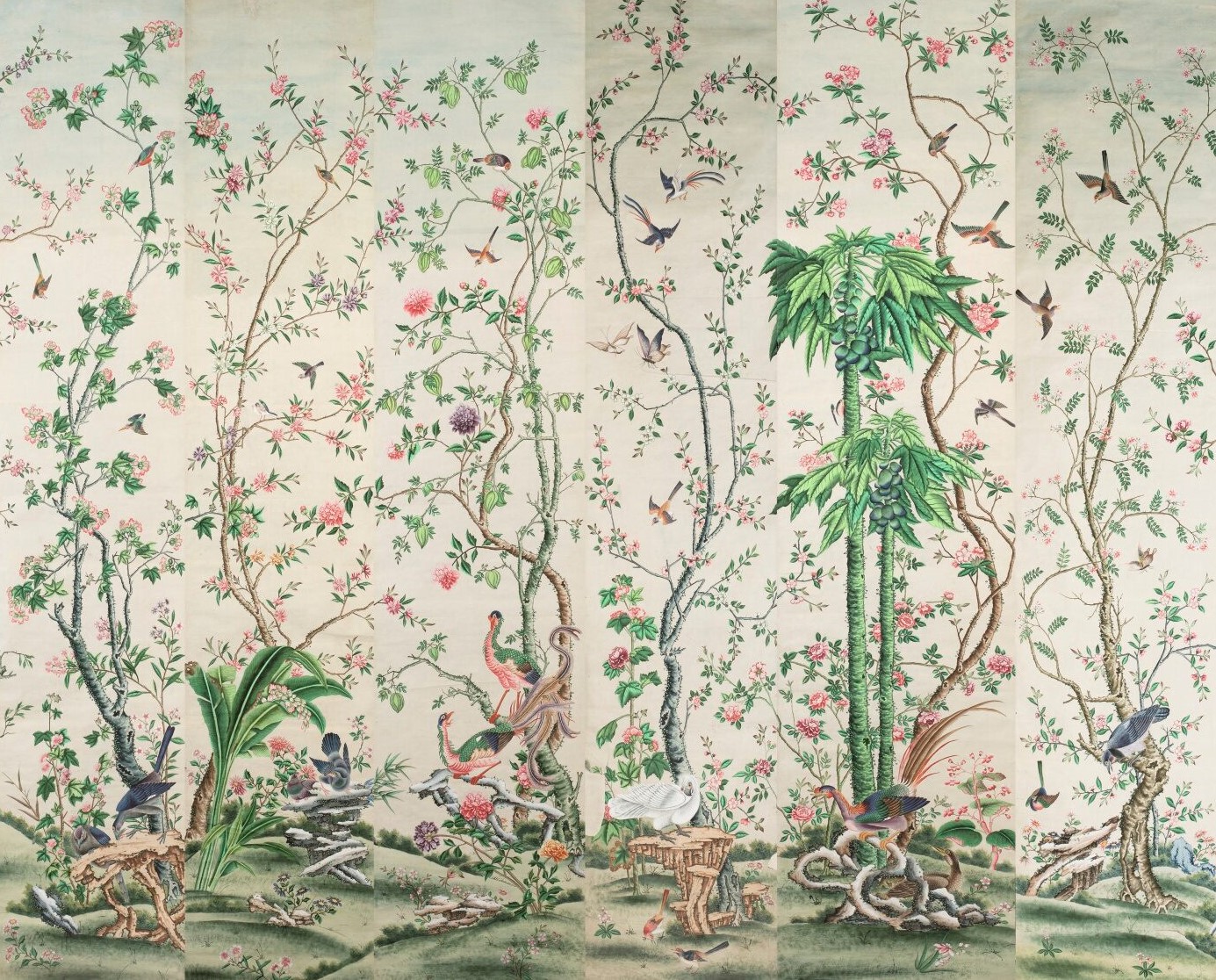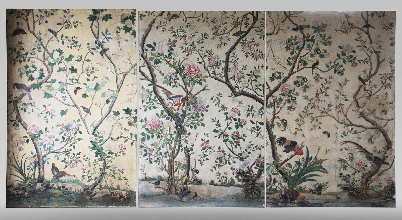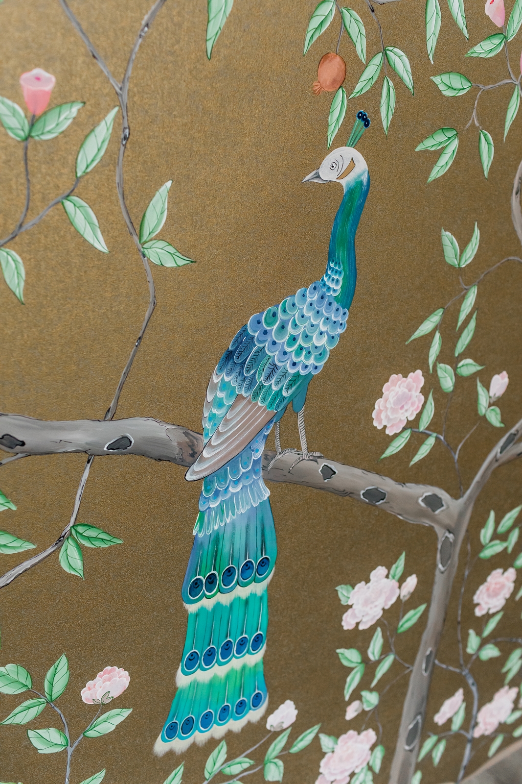 Pfauen in Granatapfelbäumen, inspiriert von einem Original aus der Qing Dynastie. Das Paneel-Set besteht aus drei Paneelen, das Tapeten-Set aus vier Tapetenstreifen.