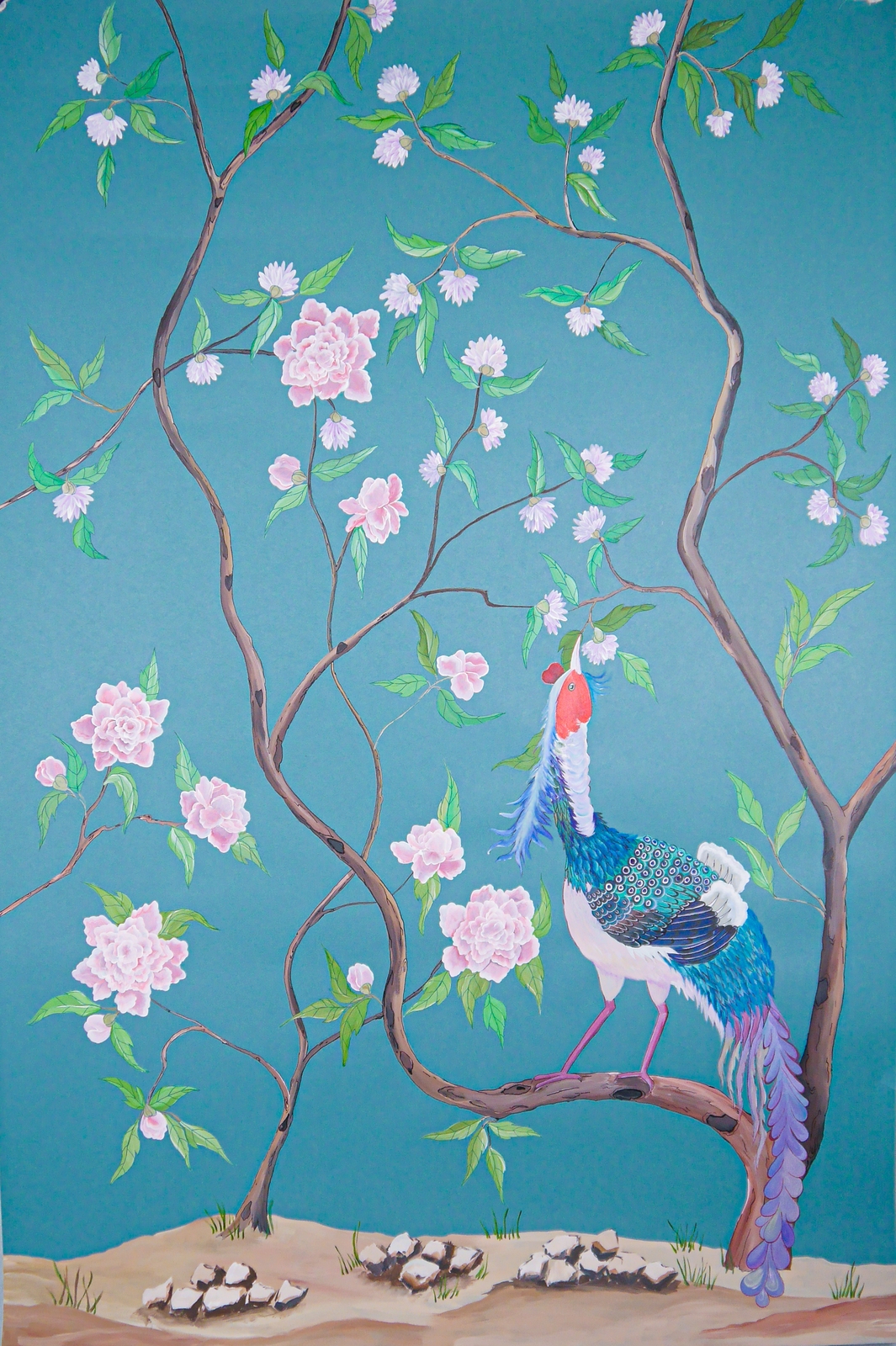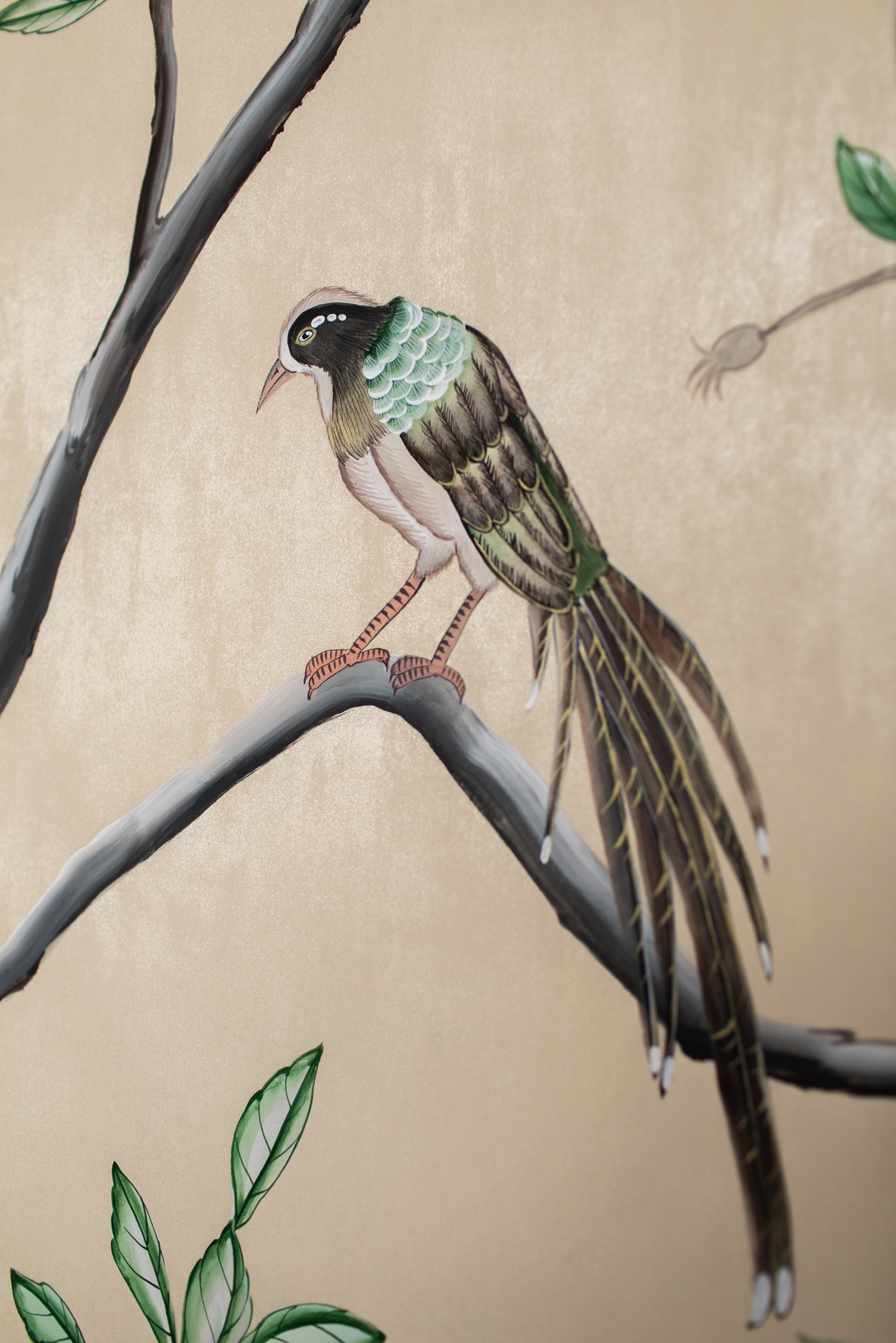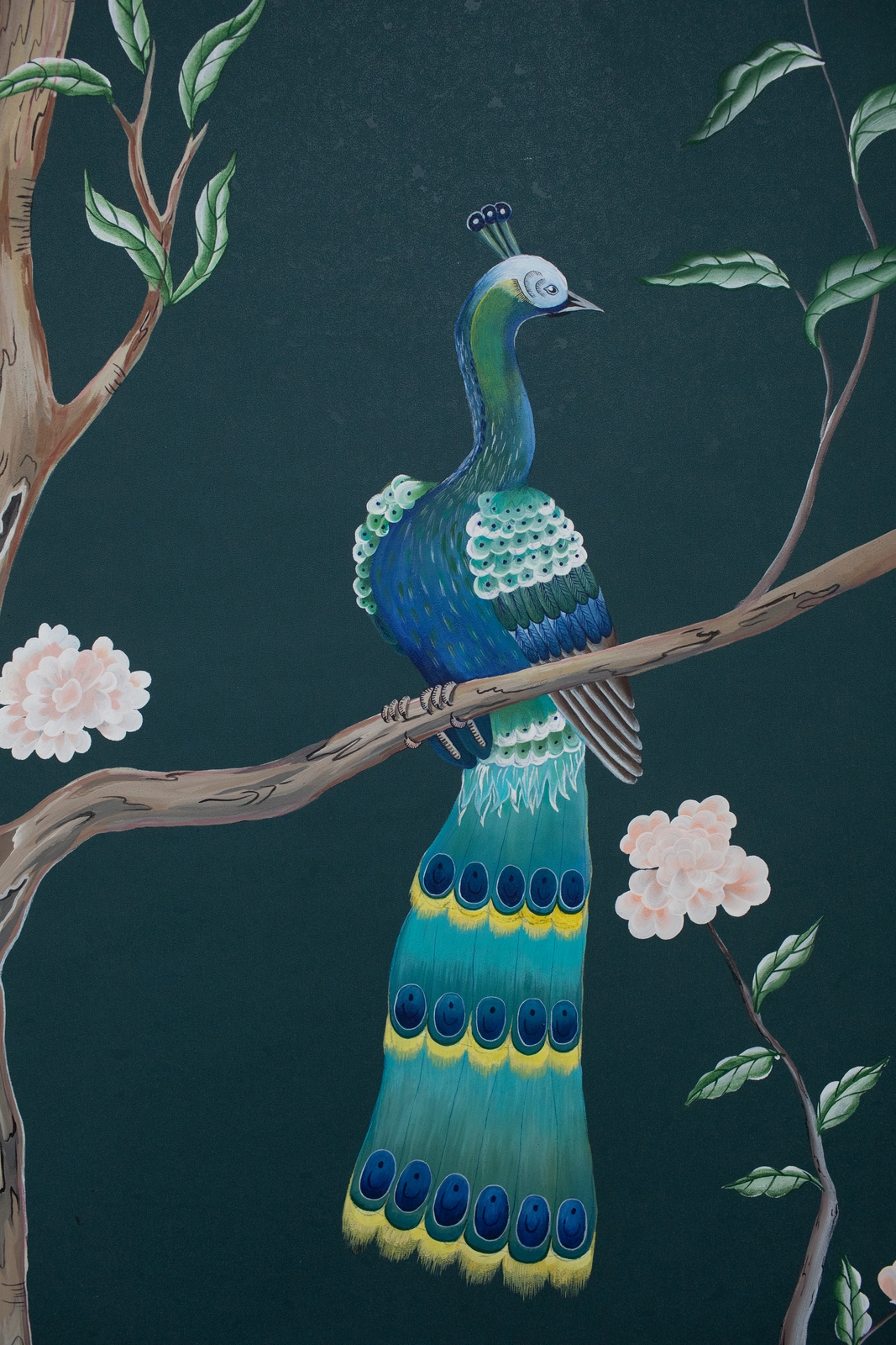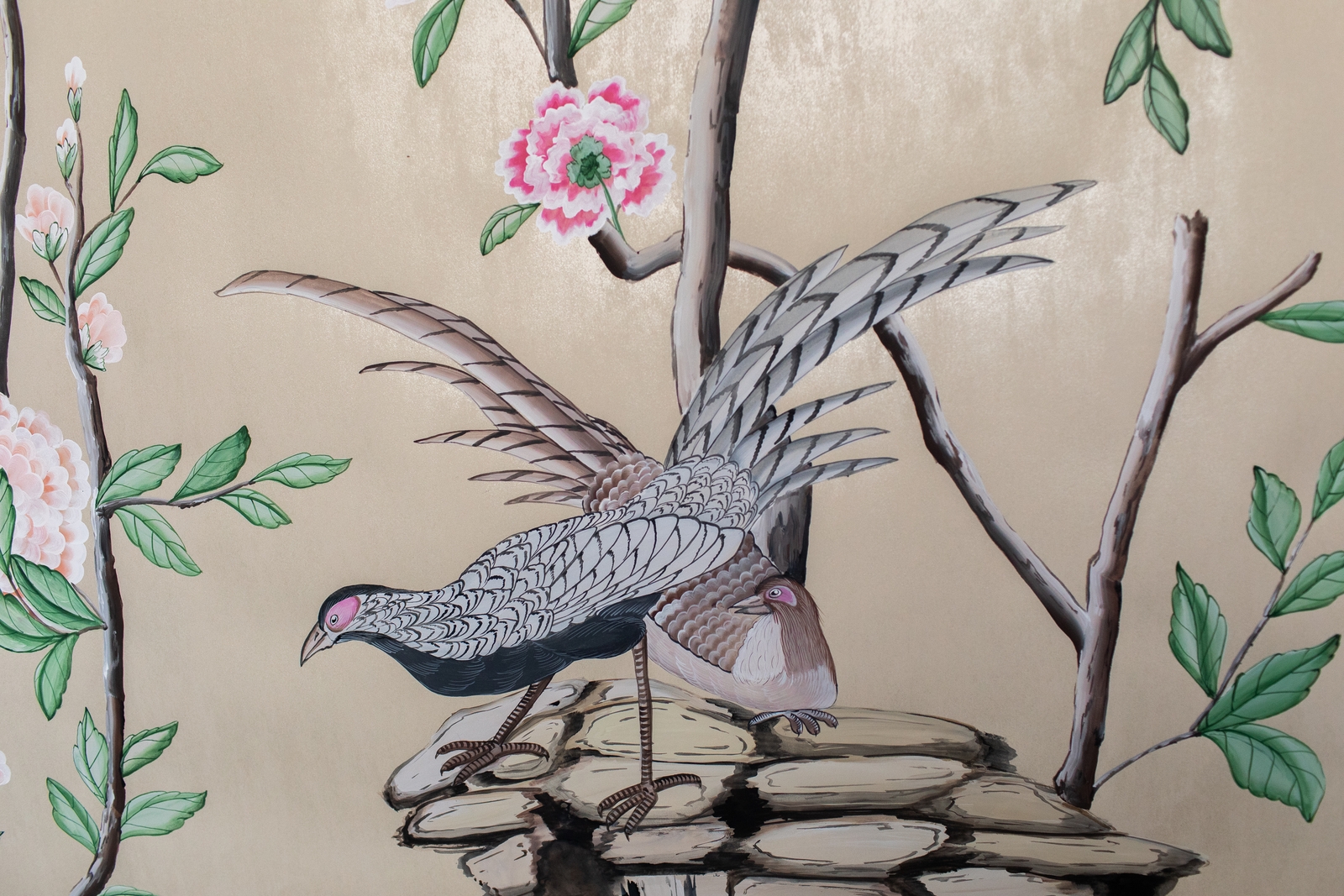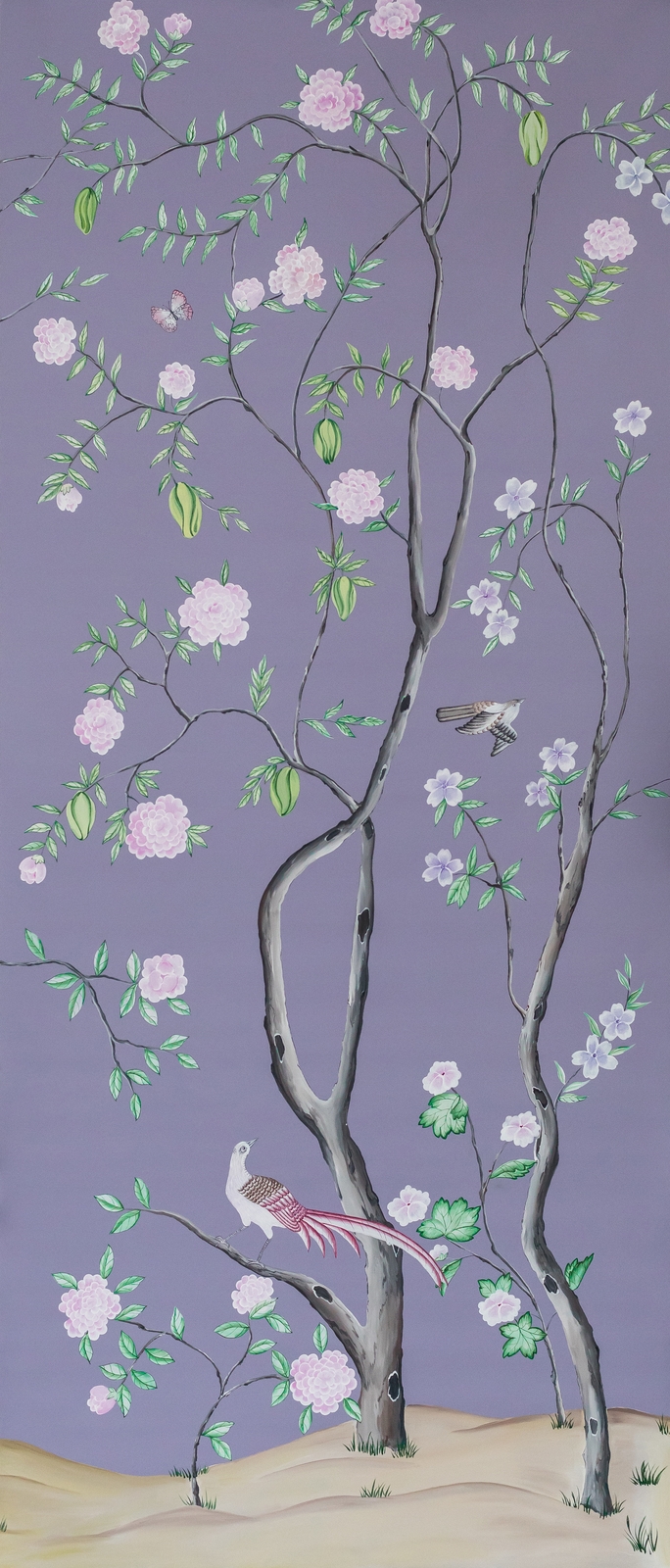 Pfauen in Granatapfelbäumen, inspiriert von einem Original aus der Qing Dynastie. Das Paneel-Set besteht aus drei Paneelen, das Tapeten-Set aus vier Tapetenstreifen.