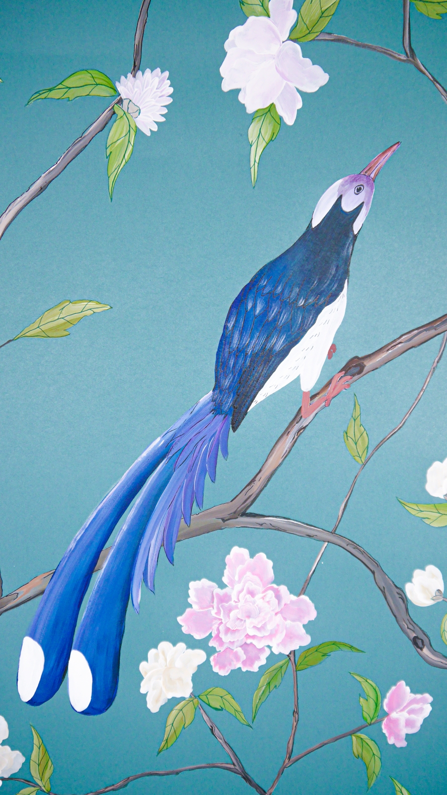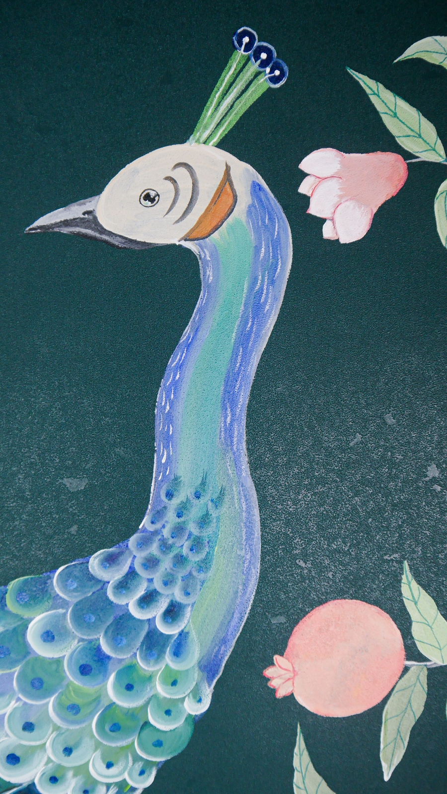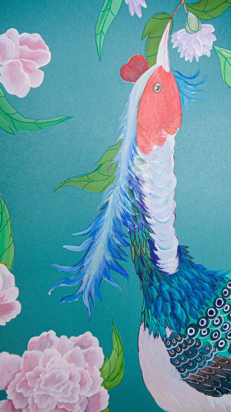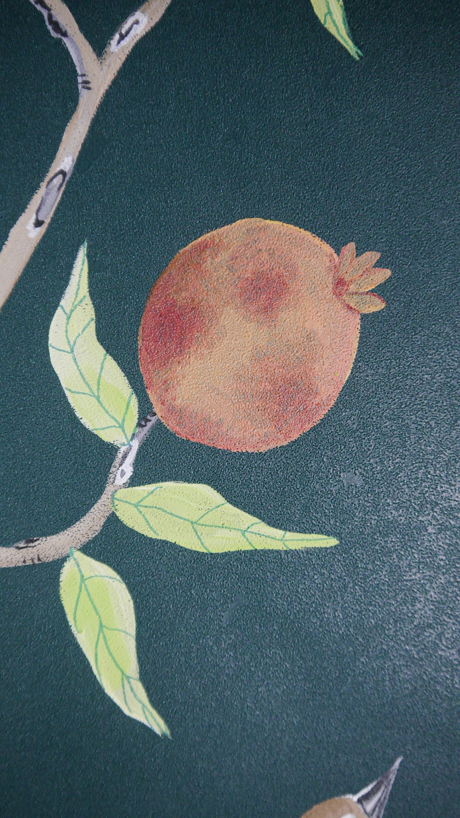 Pfauen in Granatapfelbäumen, inspiriert von einem Original aus der Qing Dynastie. Das Paneel-Set besteht aus drei Paneelen, das Tapeten-Set aus vier Tapetenstreifen.