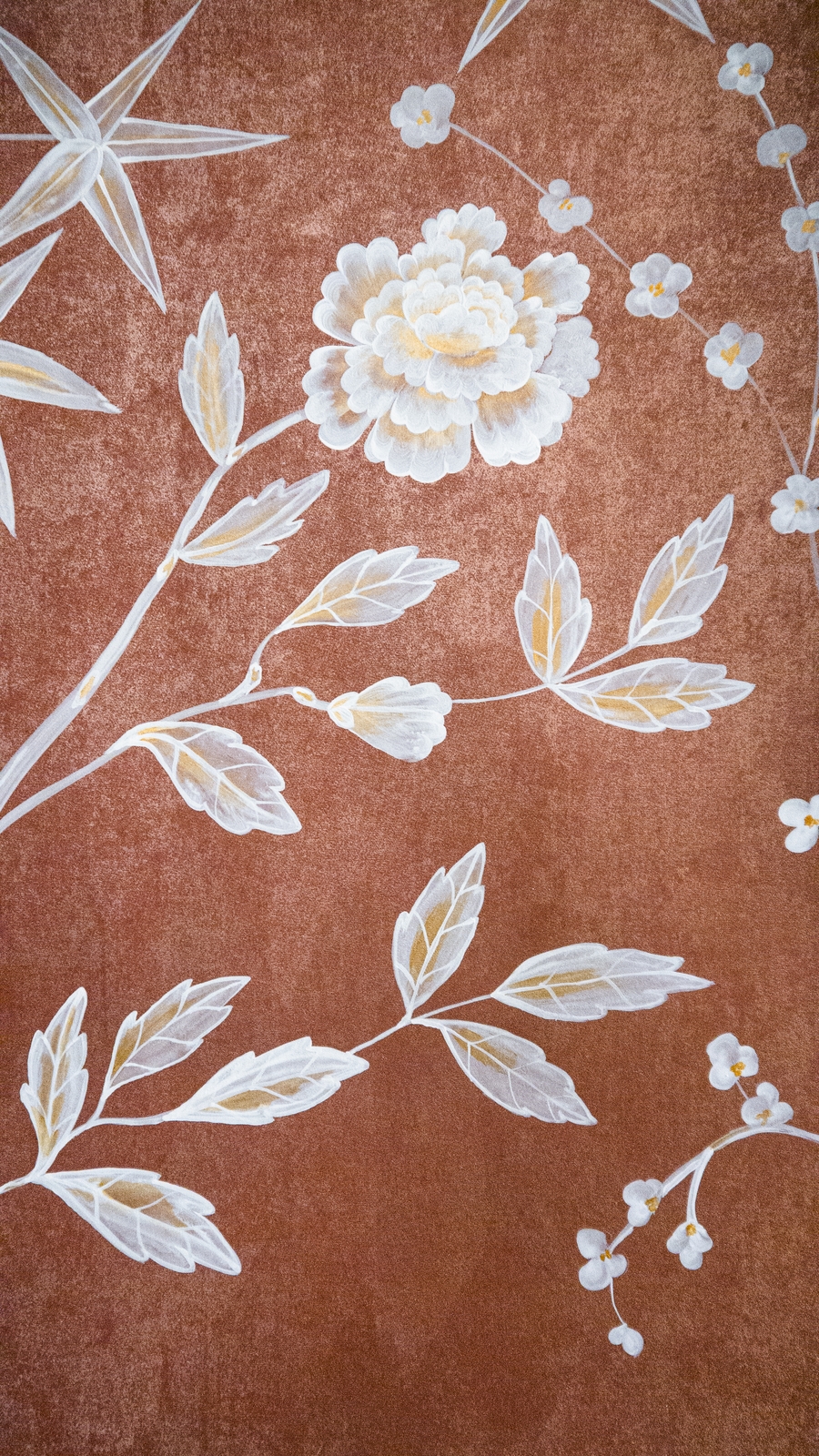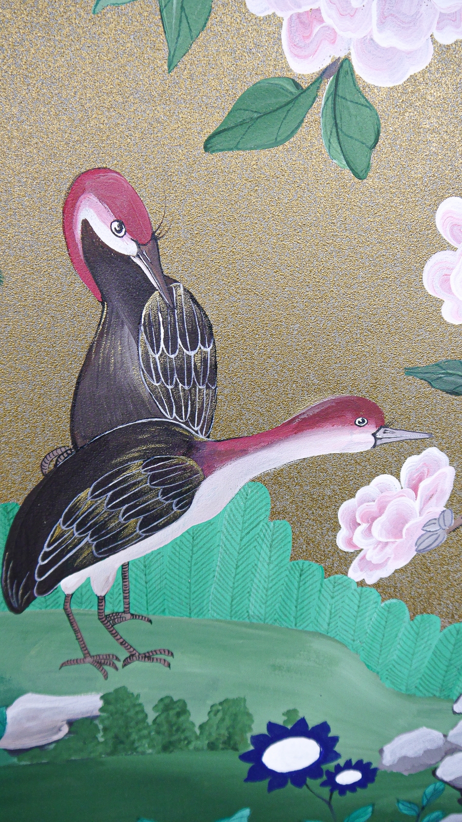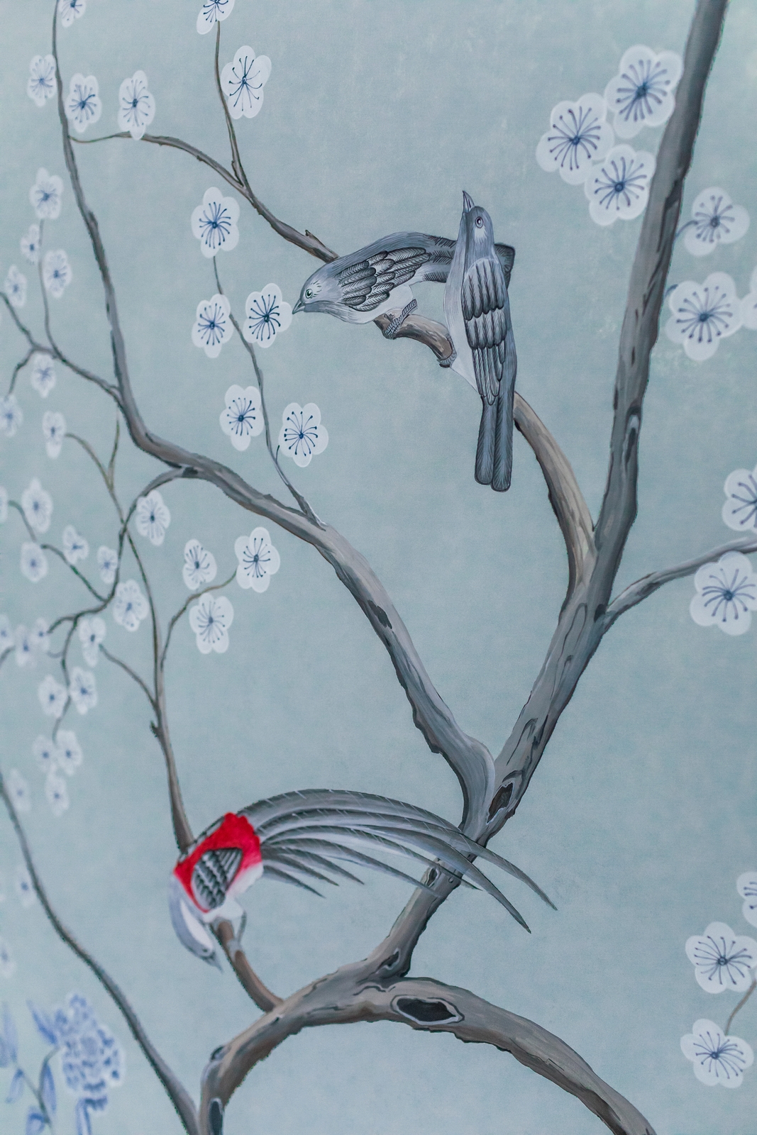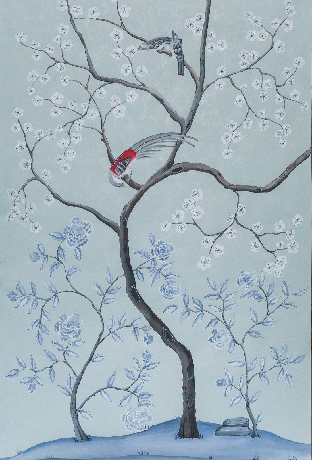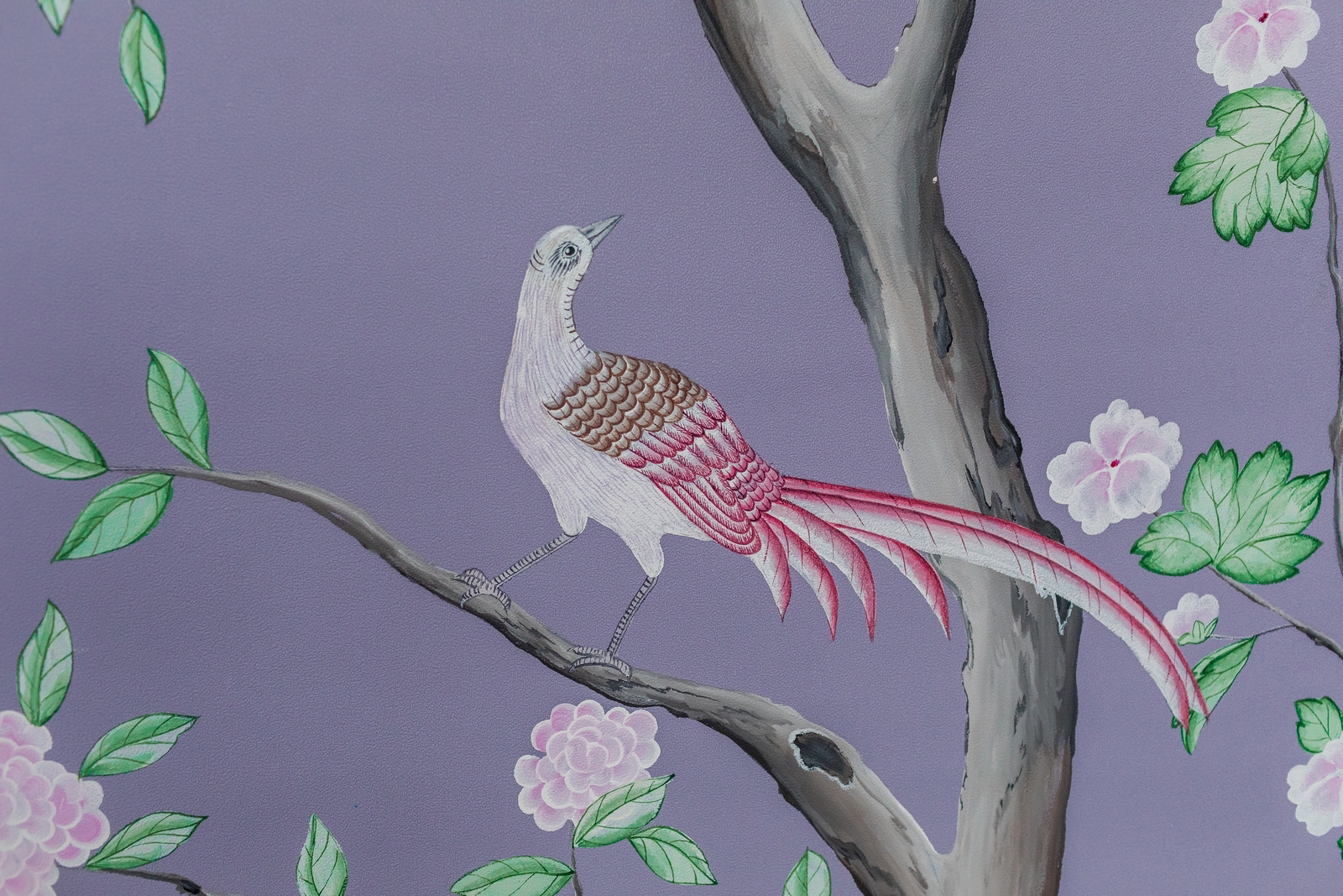 Pfauen in Granatapfelbäumen, inspiriert von einem Original aus der Qing Dynastie. Das Paneel-Set besteht aus drei Paneelen, das Tapeten-Set aus vier Tapetenstreifen.
