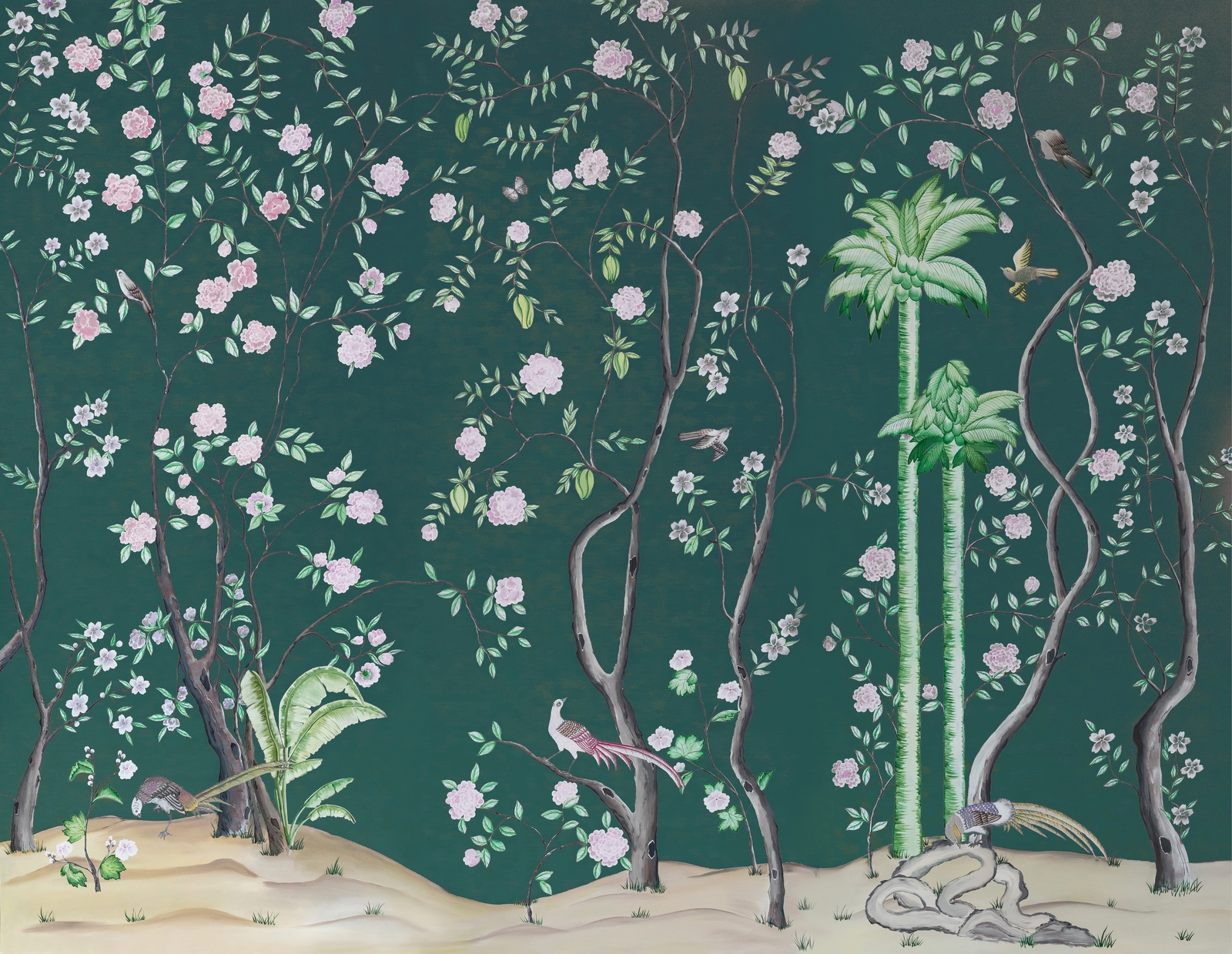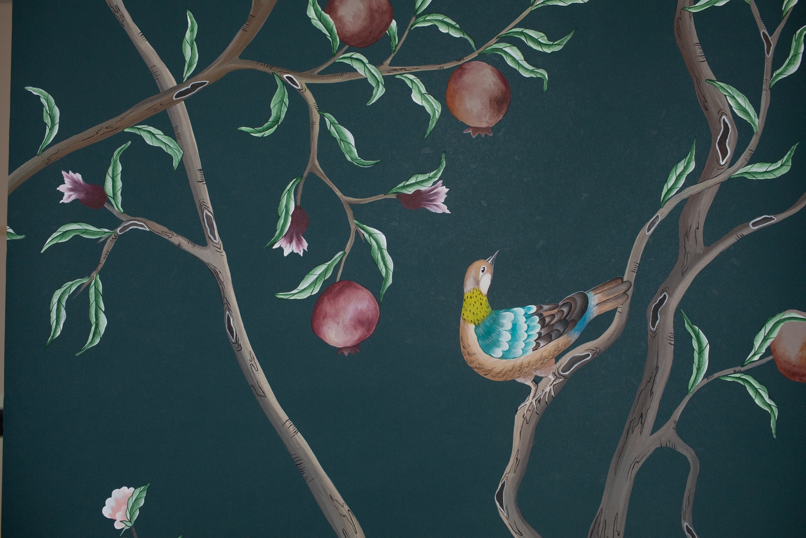 Pfauen und Paradiesvögel in Granatapfelbäumen, inspiriert von einem Original aus der Qing Dynastie. Ein Set aus 4 Tapeten.