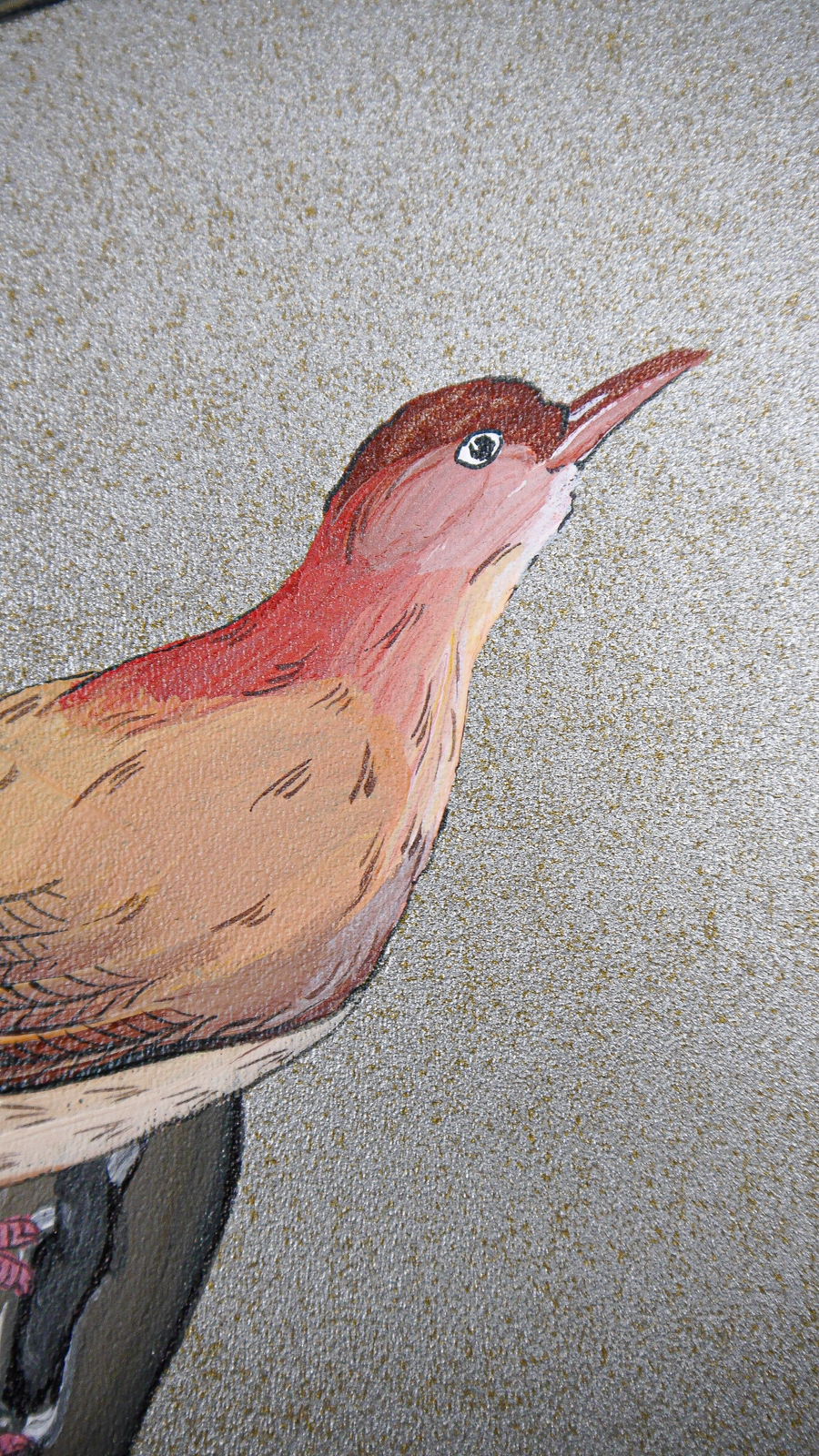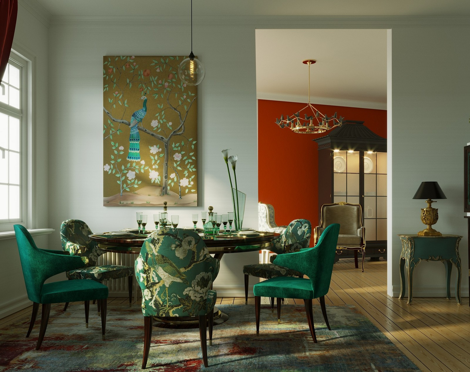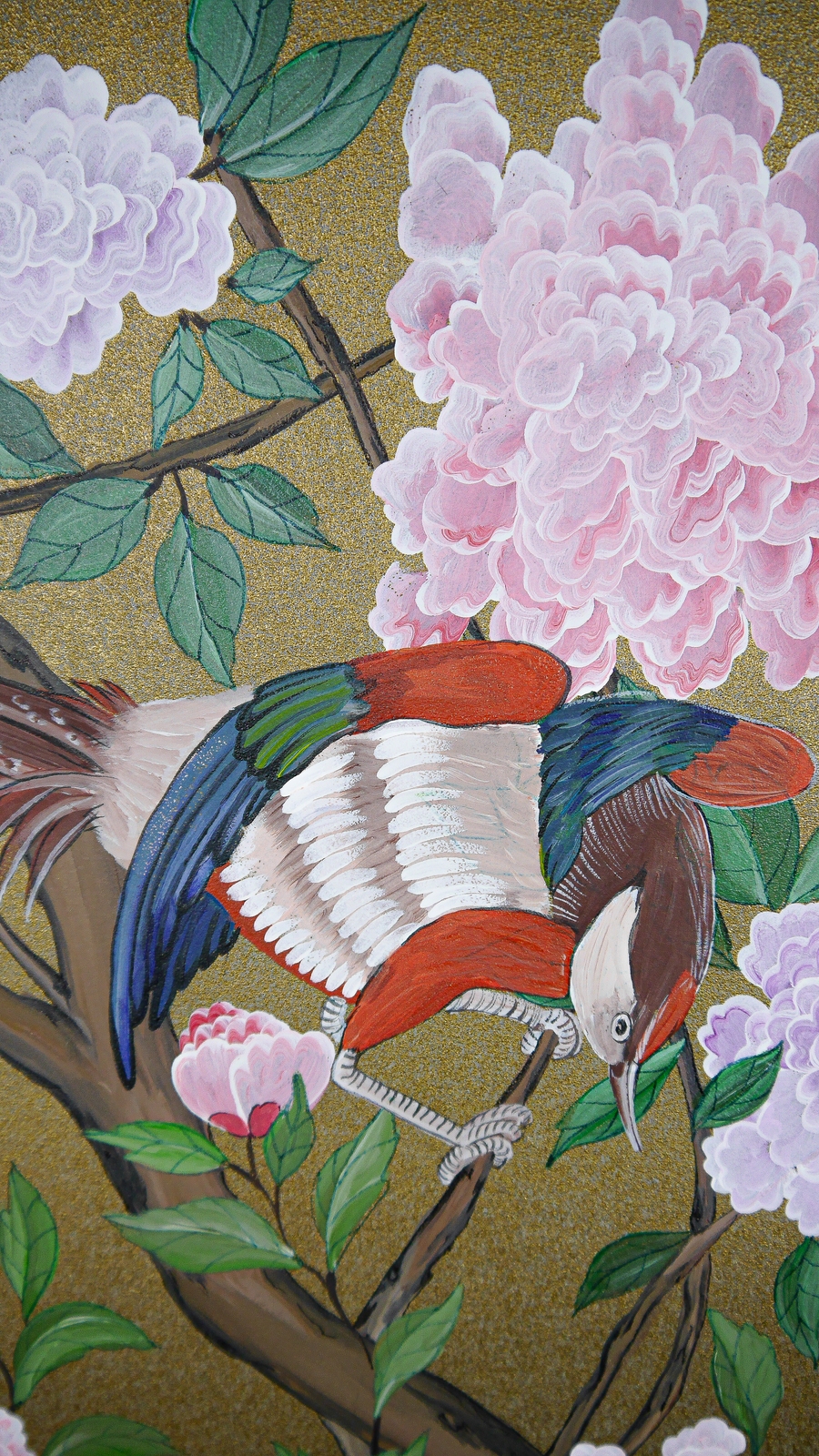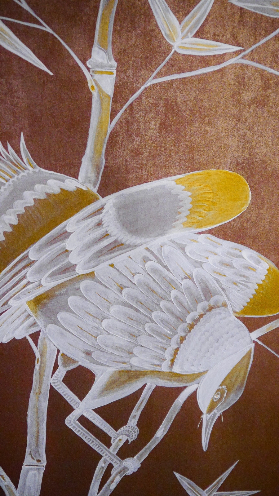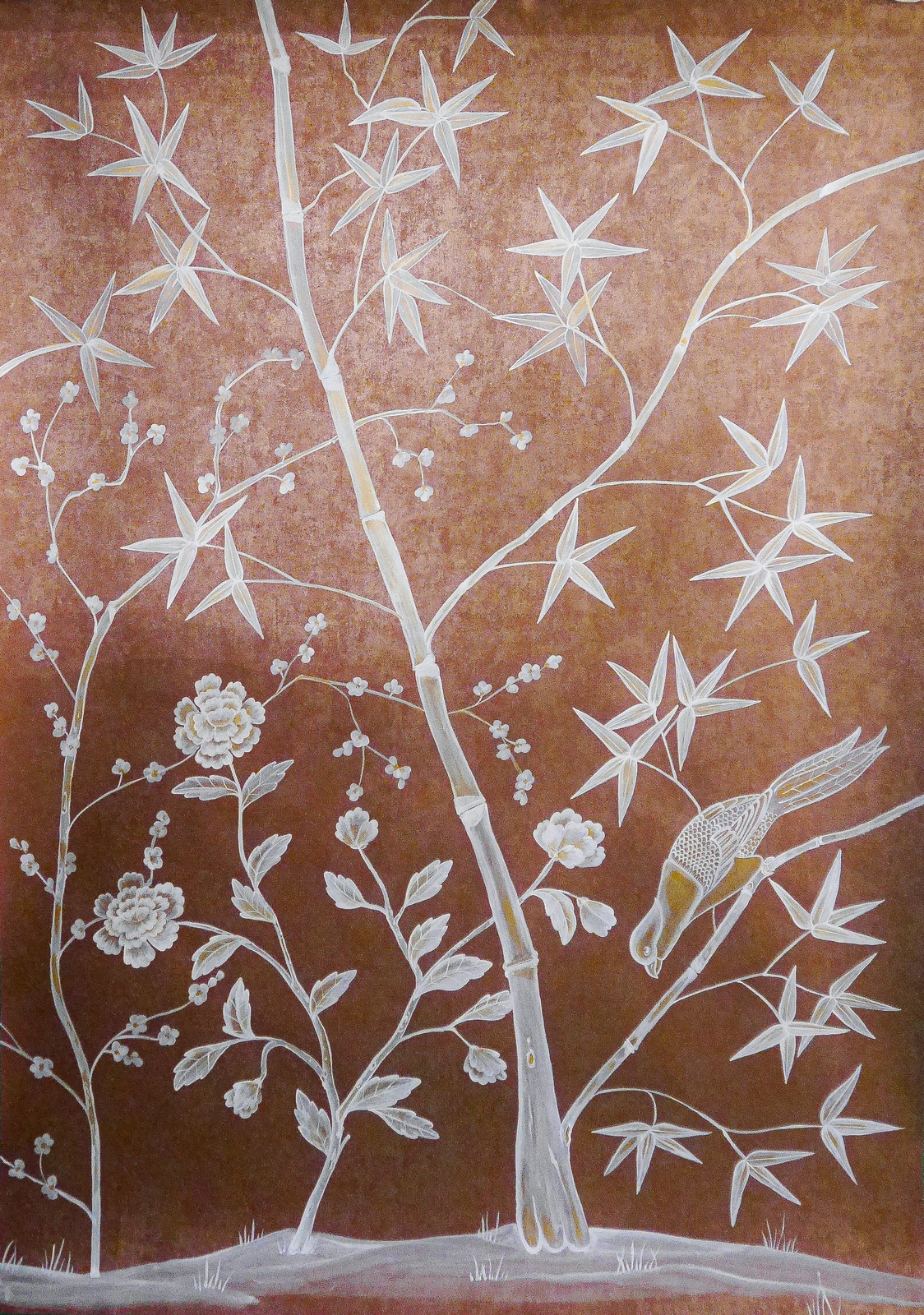 Bambus und exotische Vögel auf rotgoldenem Background, mit Elementen aus Caledon.