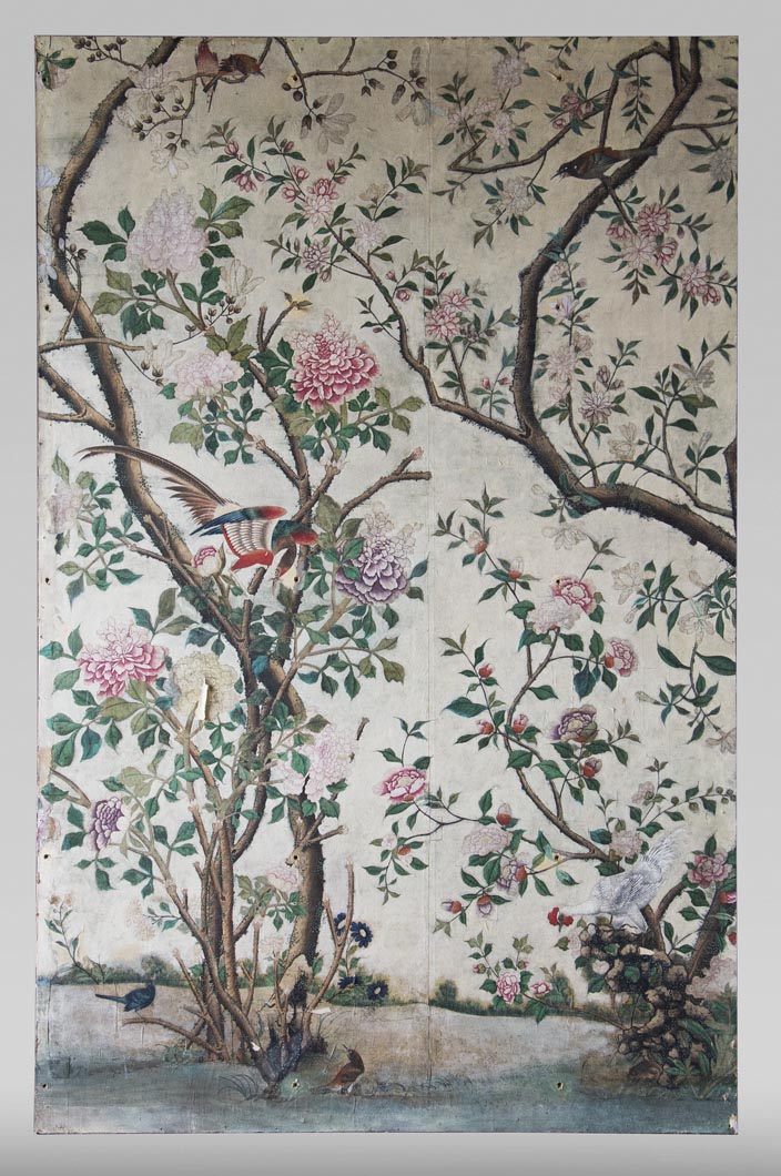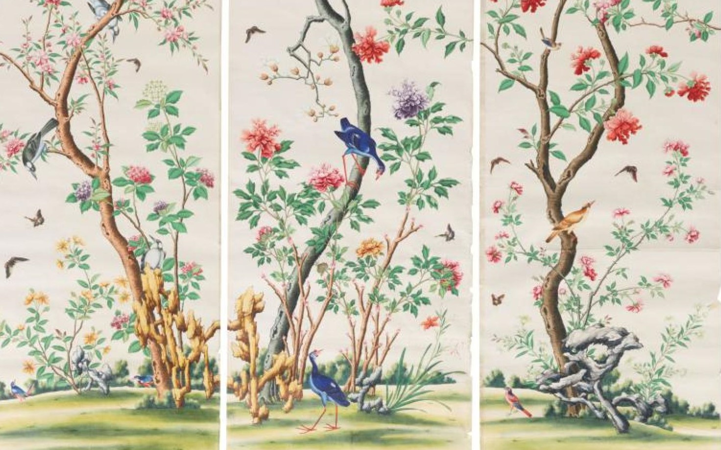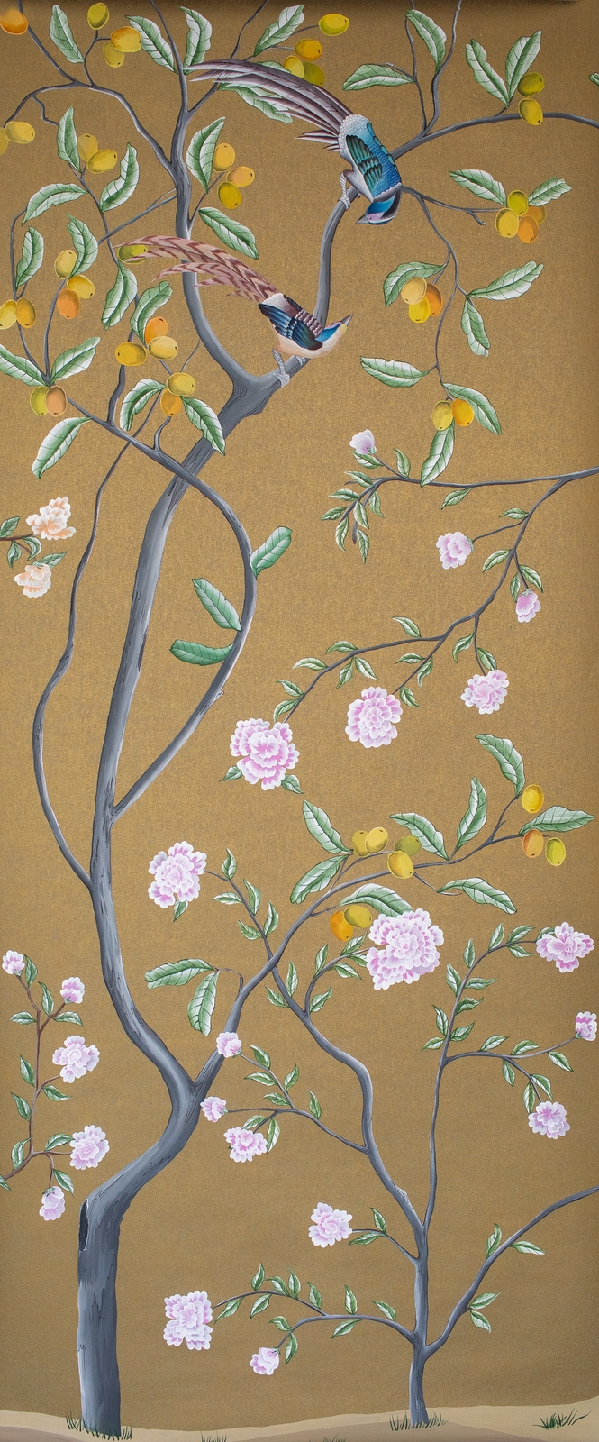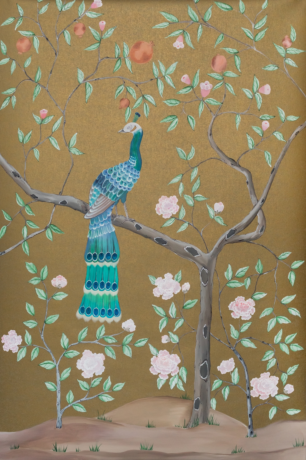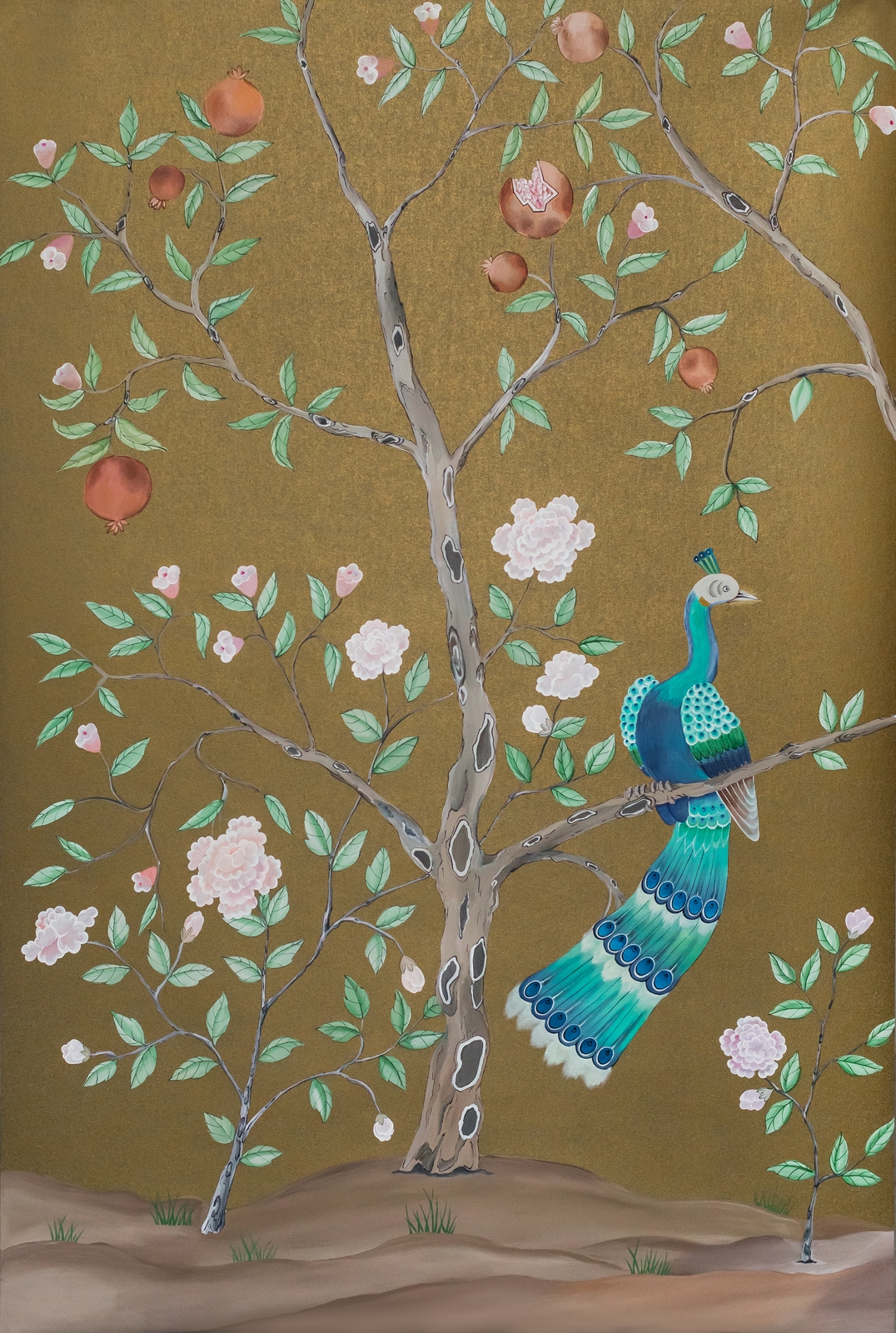 Pfauen in Granatapfelbäumen, inspiriert von einem Original aus der Qing Dynastie. Das Paneel-Set besteht aus drei Paneelen, das Tapeten-Set aus vier Tapetenstreifen.