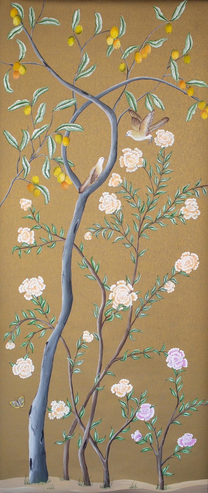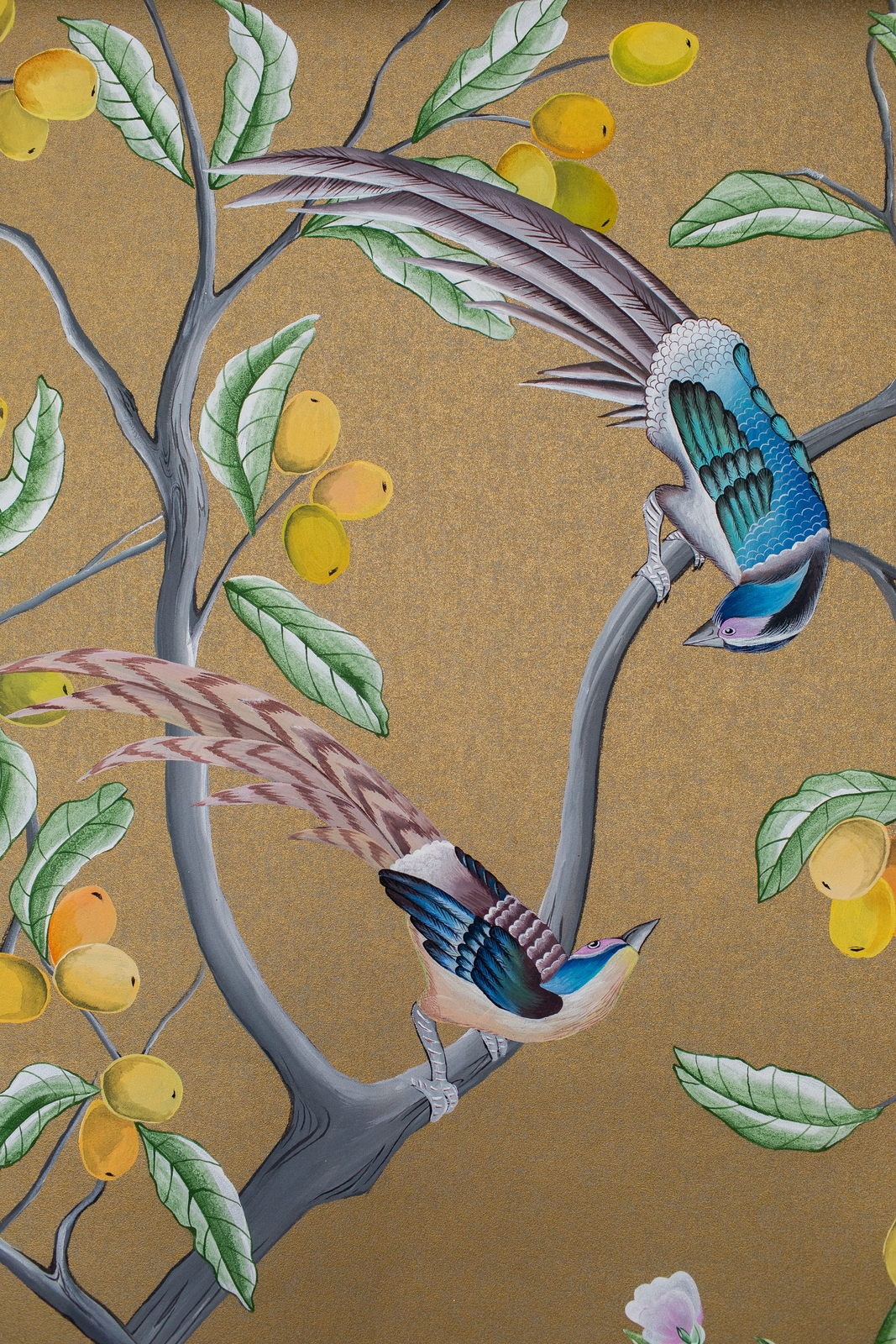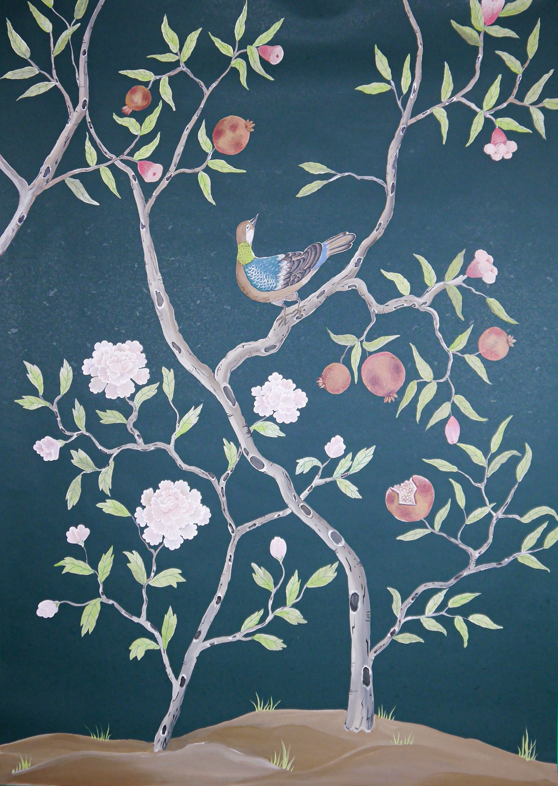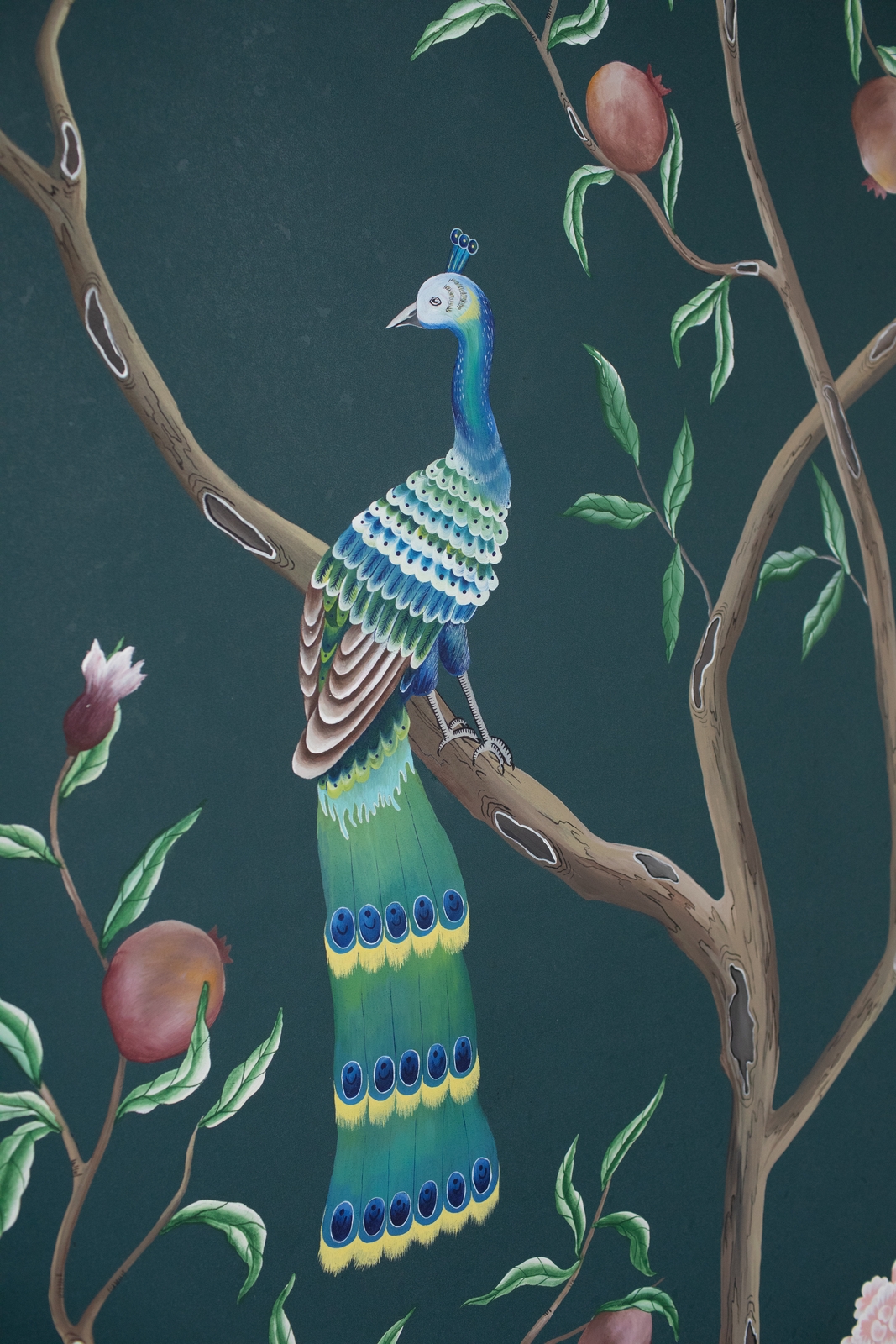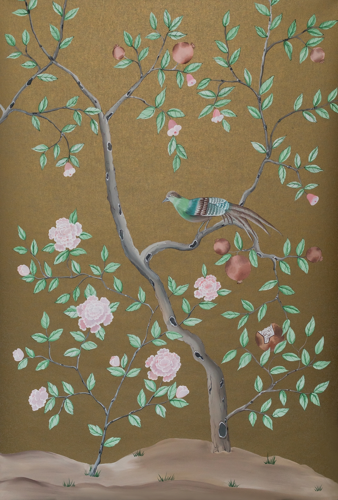Pfauen in Granatapfelbäumen, inspiriert von einem Original aus der Qing Dynastie. Das Paneel-Set besteht aus drei Paneelen, das Tapeten-Set aus vier Tapetenstreifen.