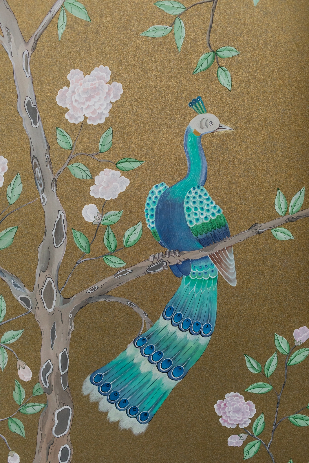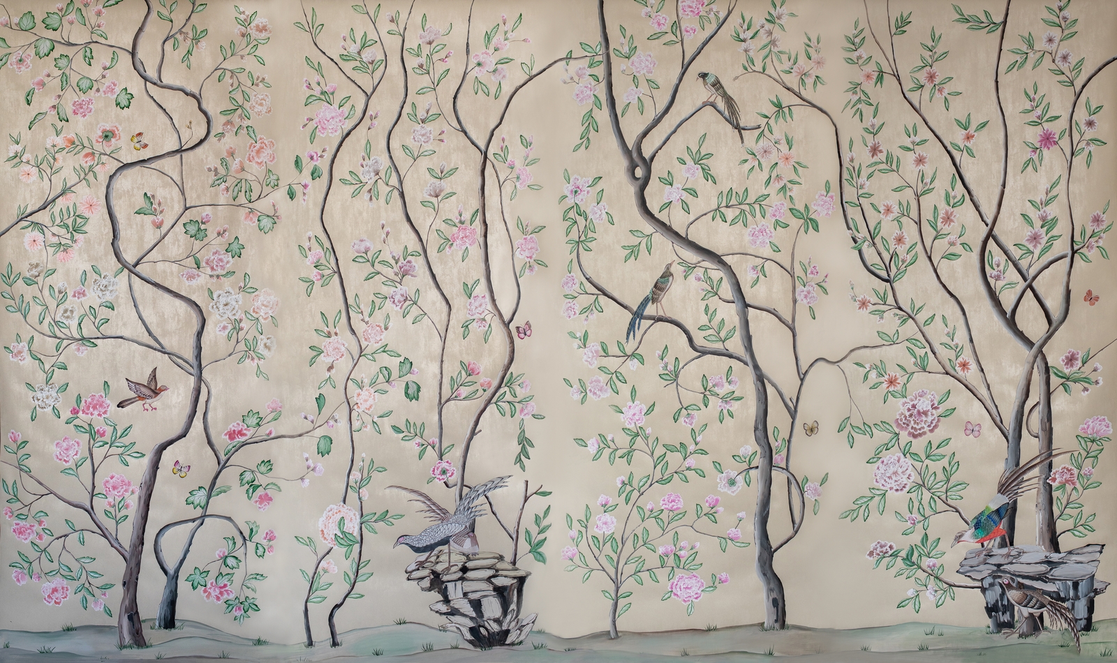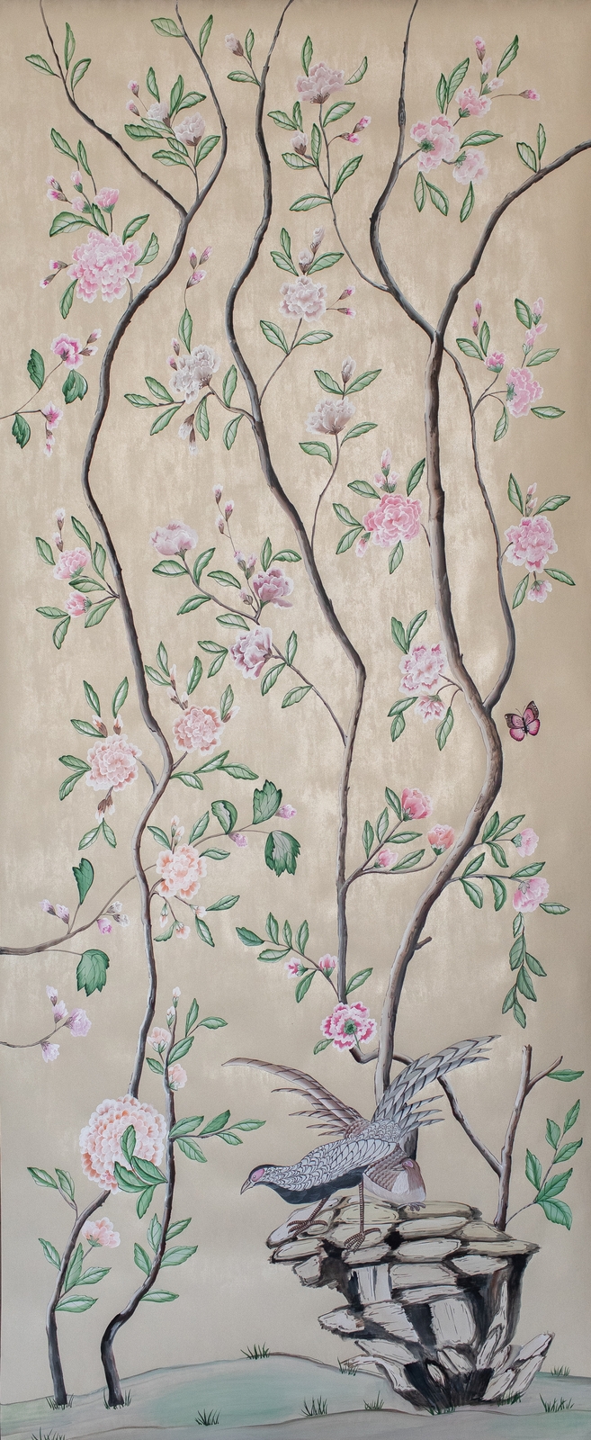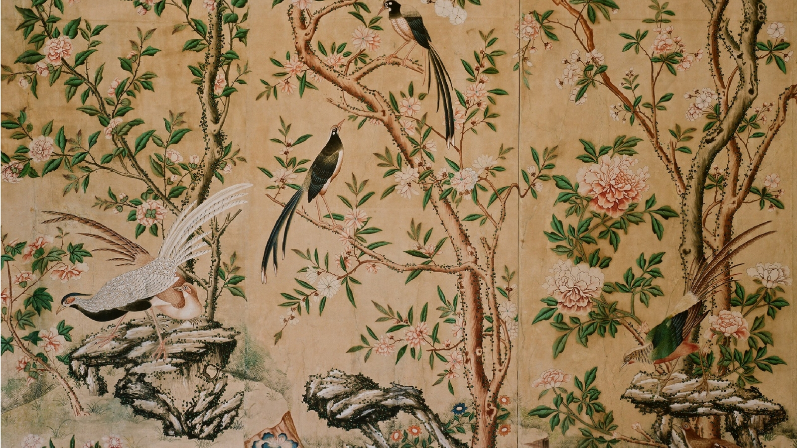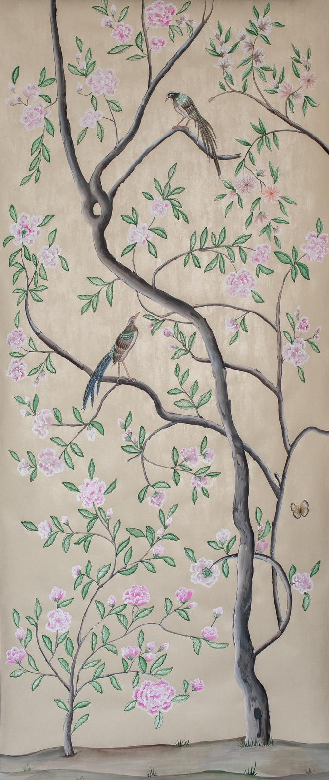 Pfauen in Granatapfelbäumen, inspiriert von einem Original aus der Qing Dynastie. Das Paneel-Set besteht aus drei Paneelen, das Tapeten-Set aus vier Tapetenstreifen.