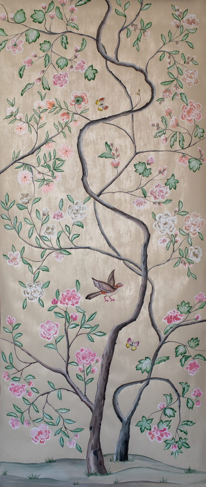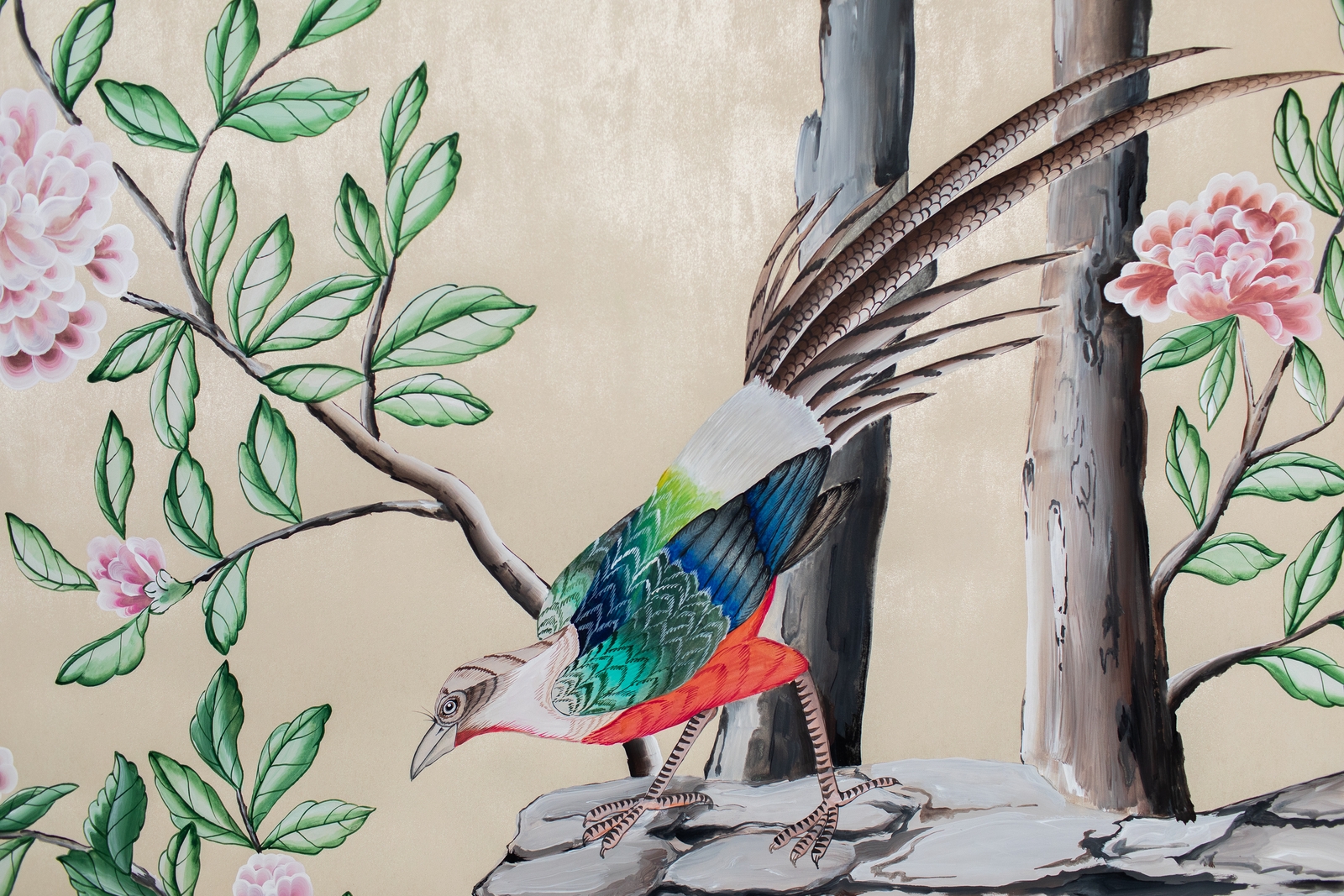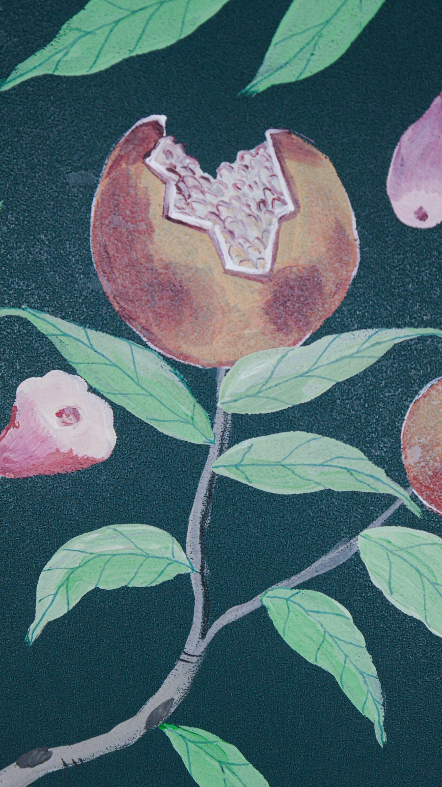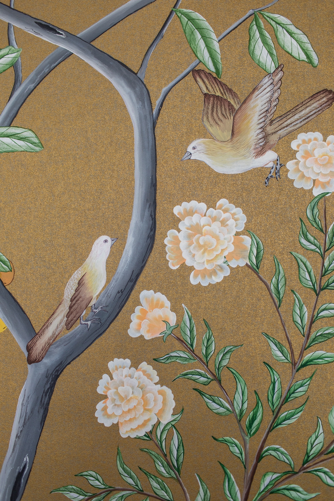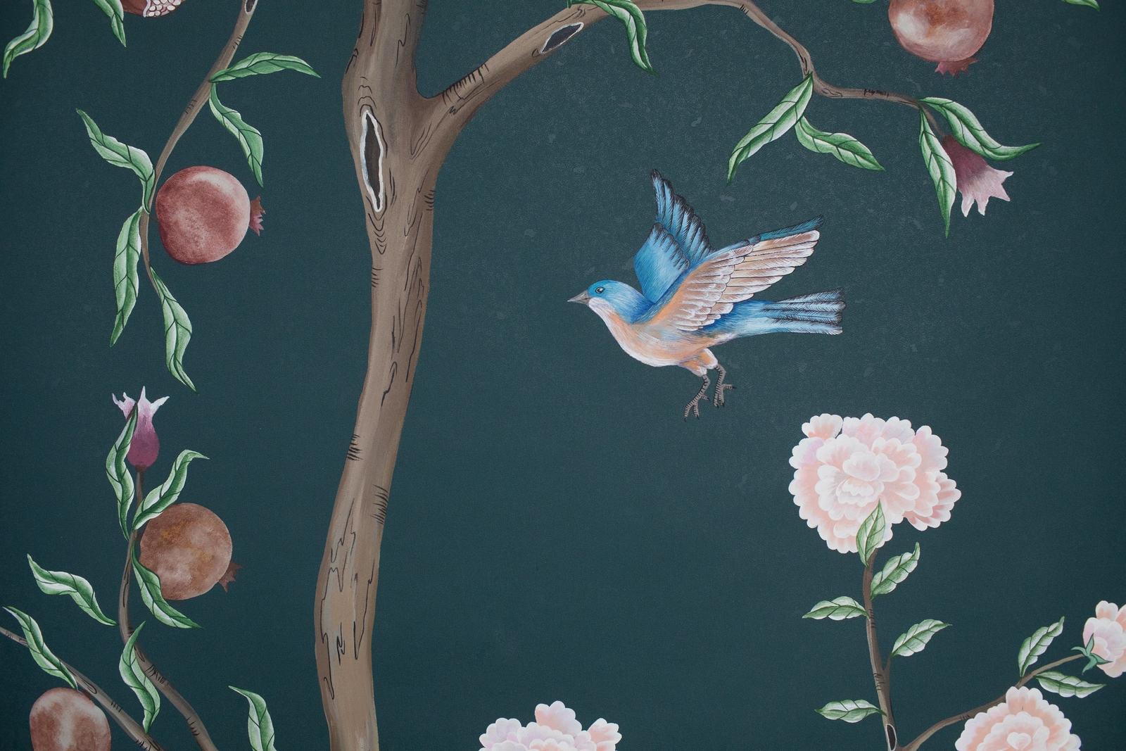 Pfauen in Granatapfelbäumen, inspiriert von einem Original aus der Qing Dynastie. Das Paneel-Set besteht aus drei Paneelen, das Tapeten-Set aus vier Tapetenstreifen.