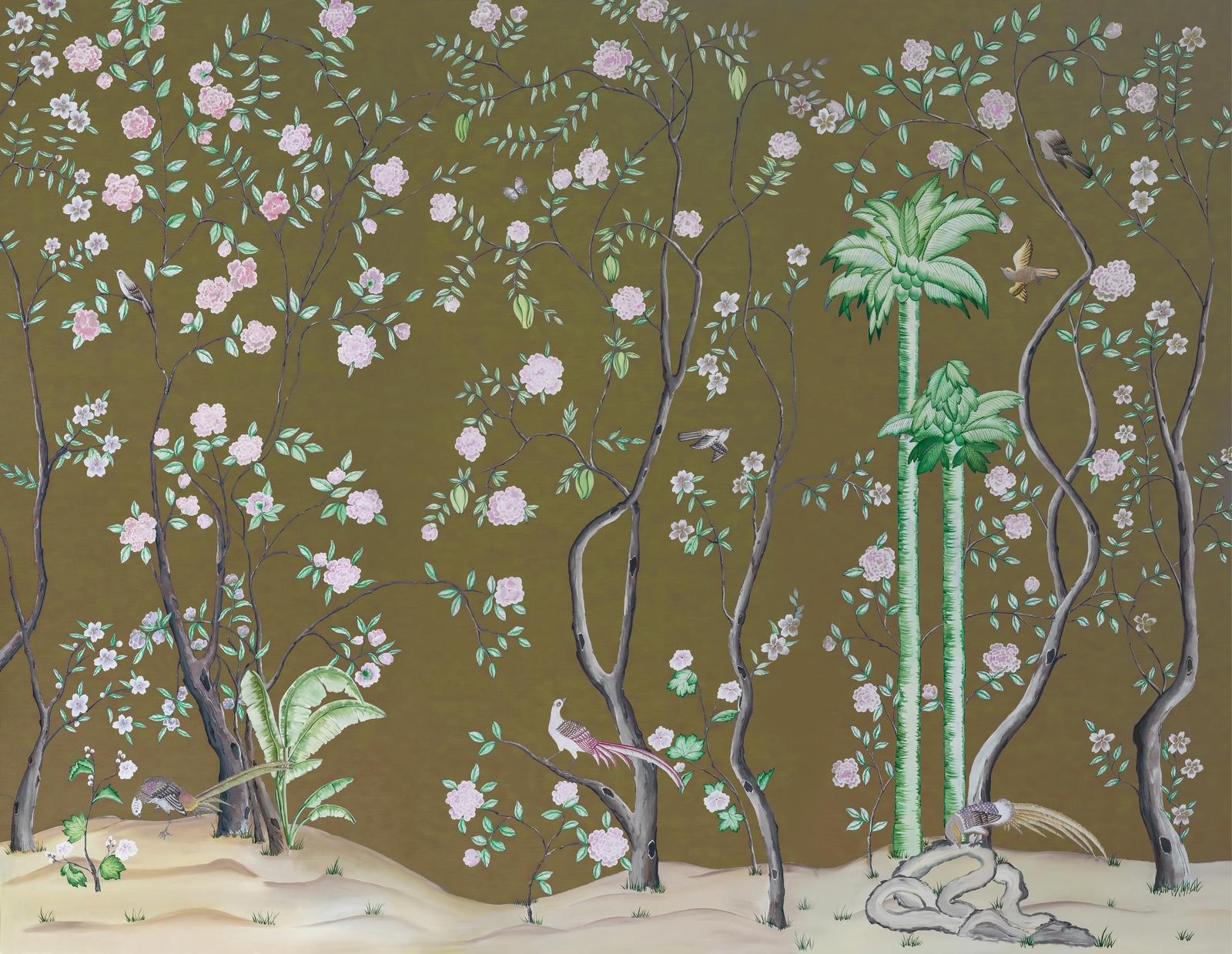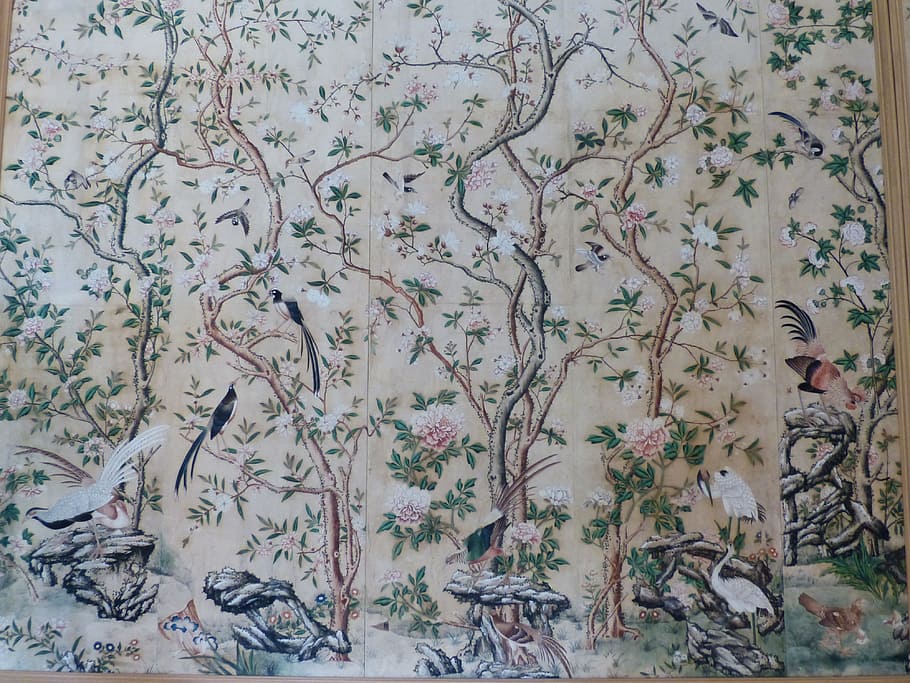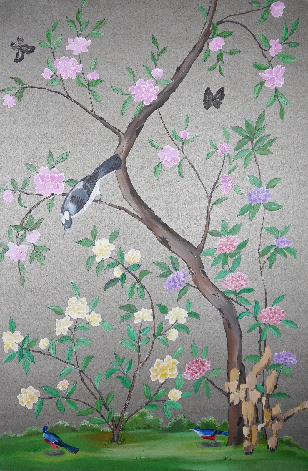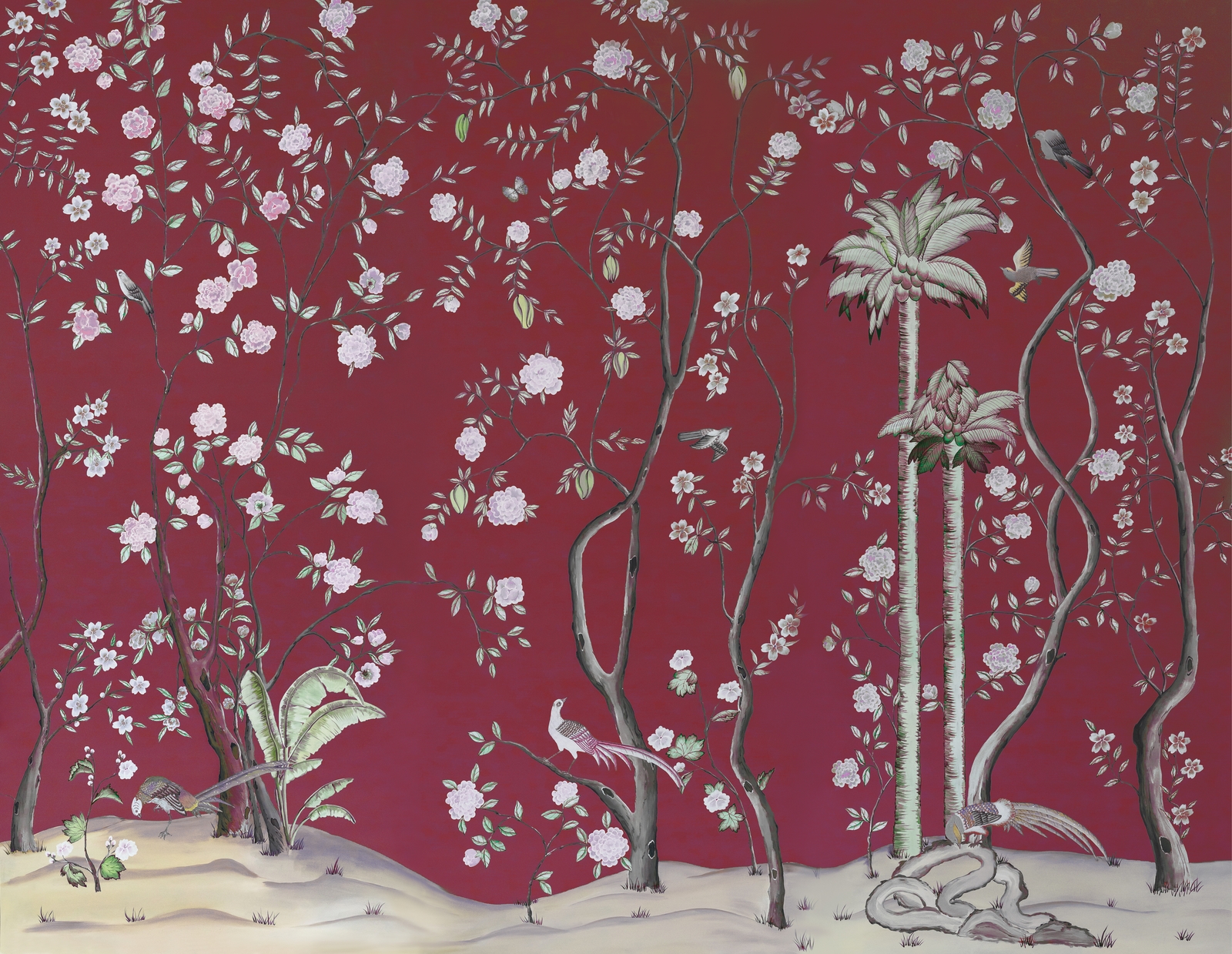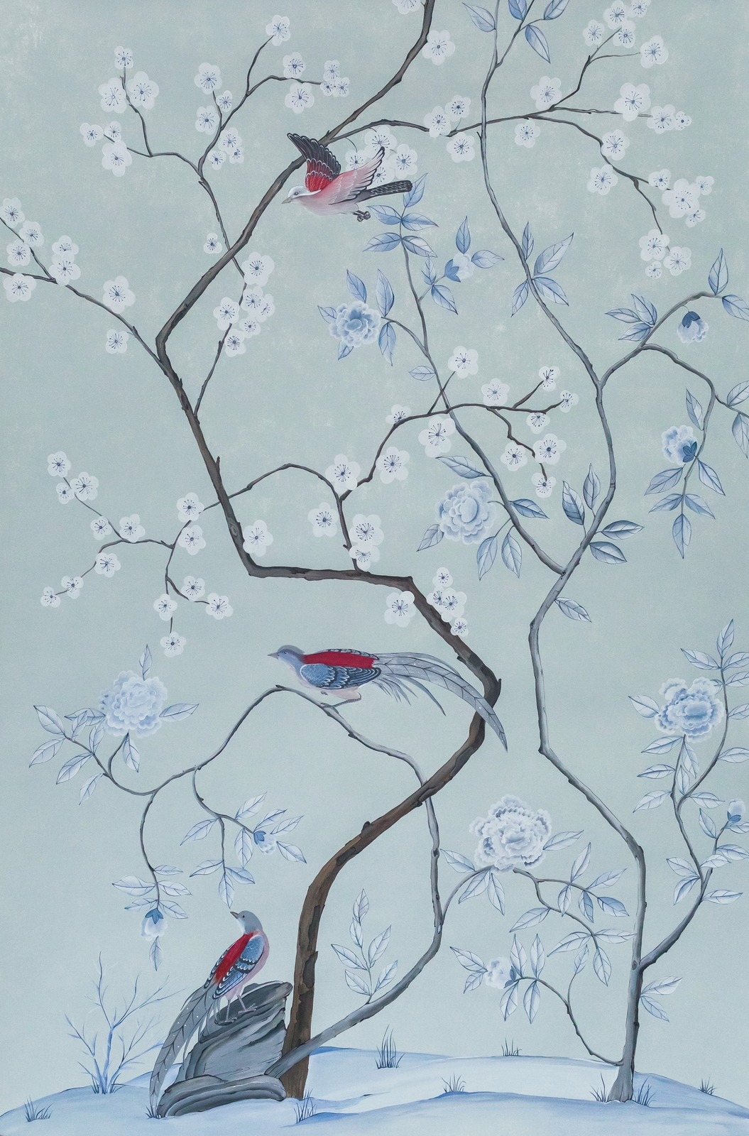 Pfauen in Granatapfelbäumen, inspiriert von einem Original aus der Qing Dynastie. Das Paneel-Set besteht aus drei Paneelen, das Tapeten-Set aus vier Tapetenstreifen.