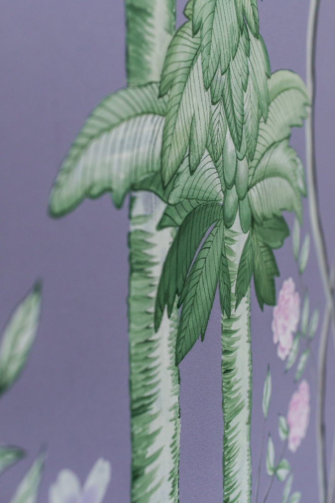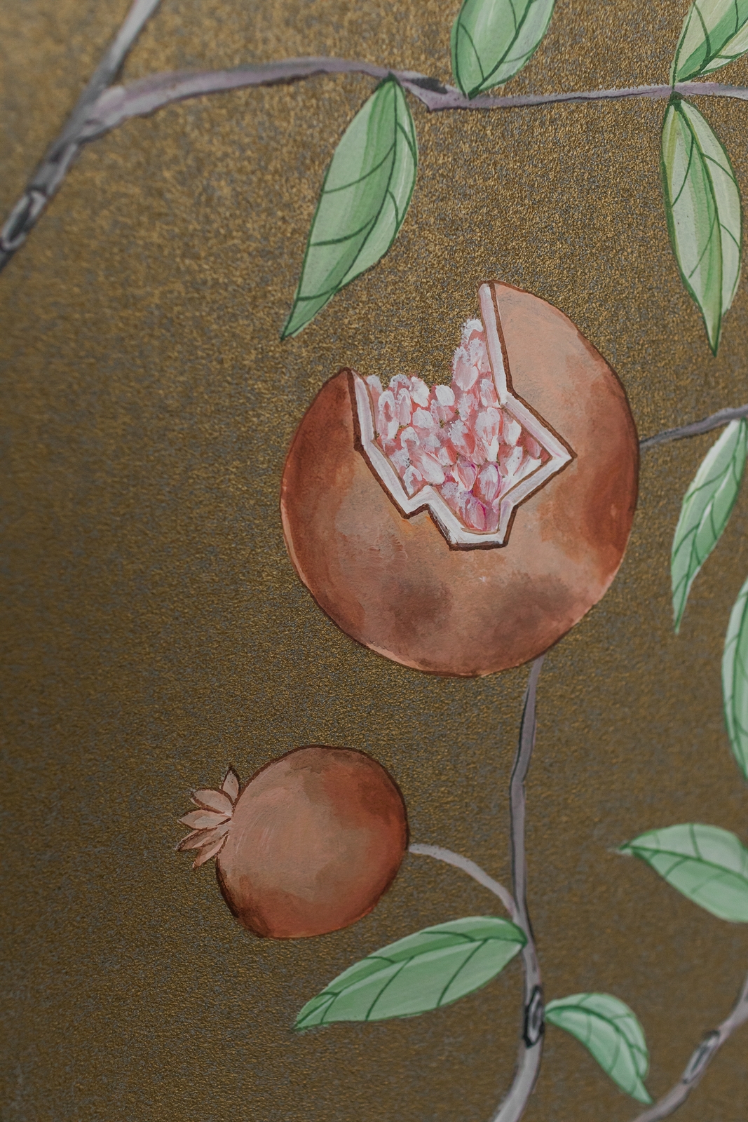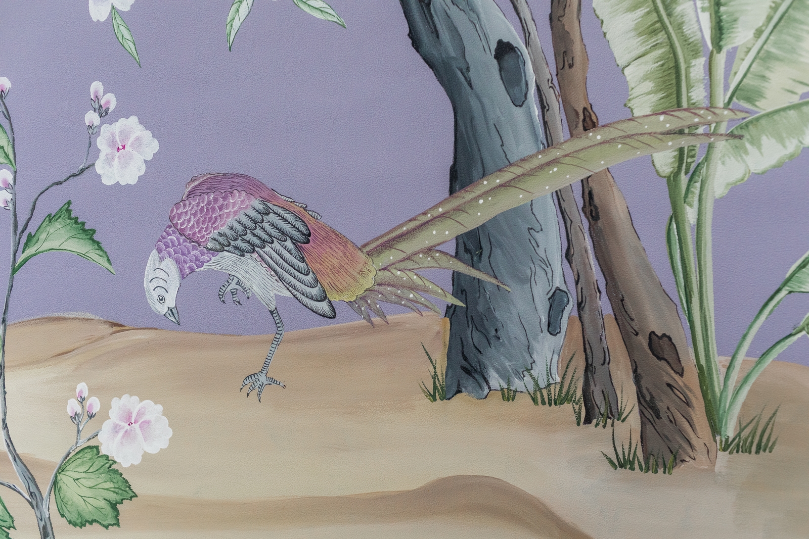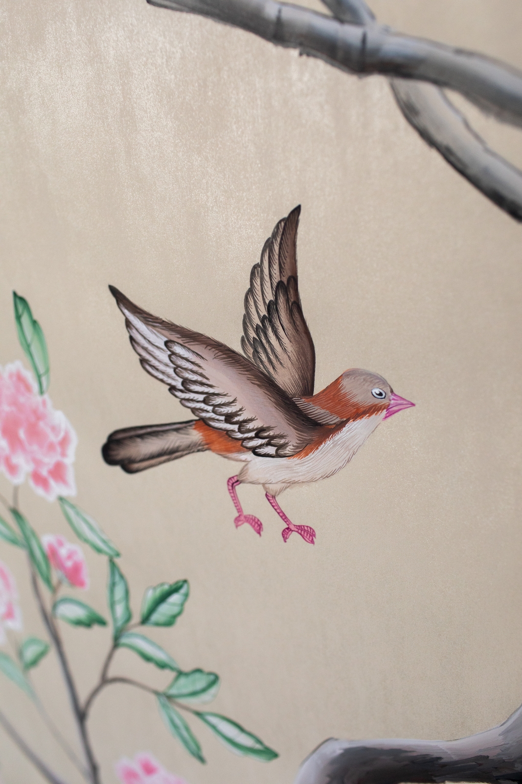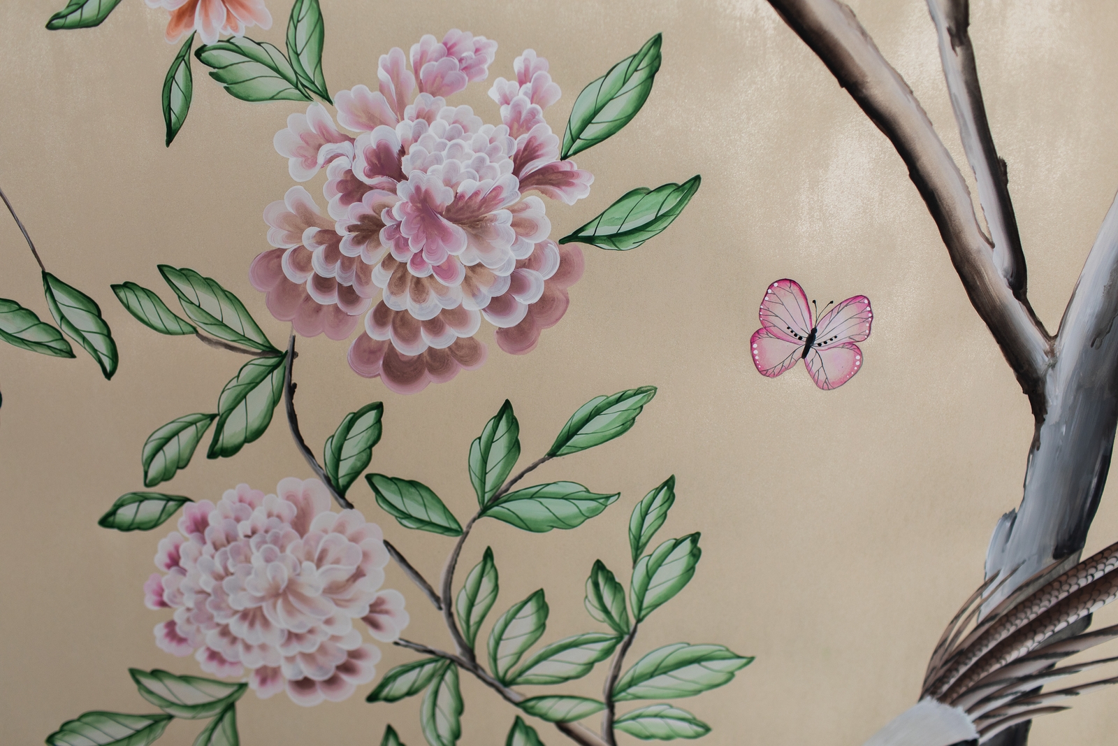 Pfauen in Granatapfelbäumen, inspiriert von einem Original aus der Qing Dynastie. Das Paneel-Set besteht aus drei Paneelen, das Tapeten-Set aus vier Tapetenstreifen.