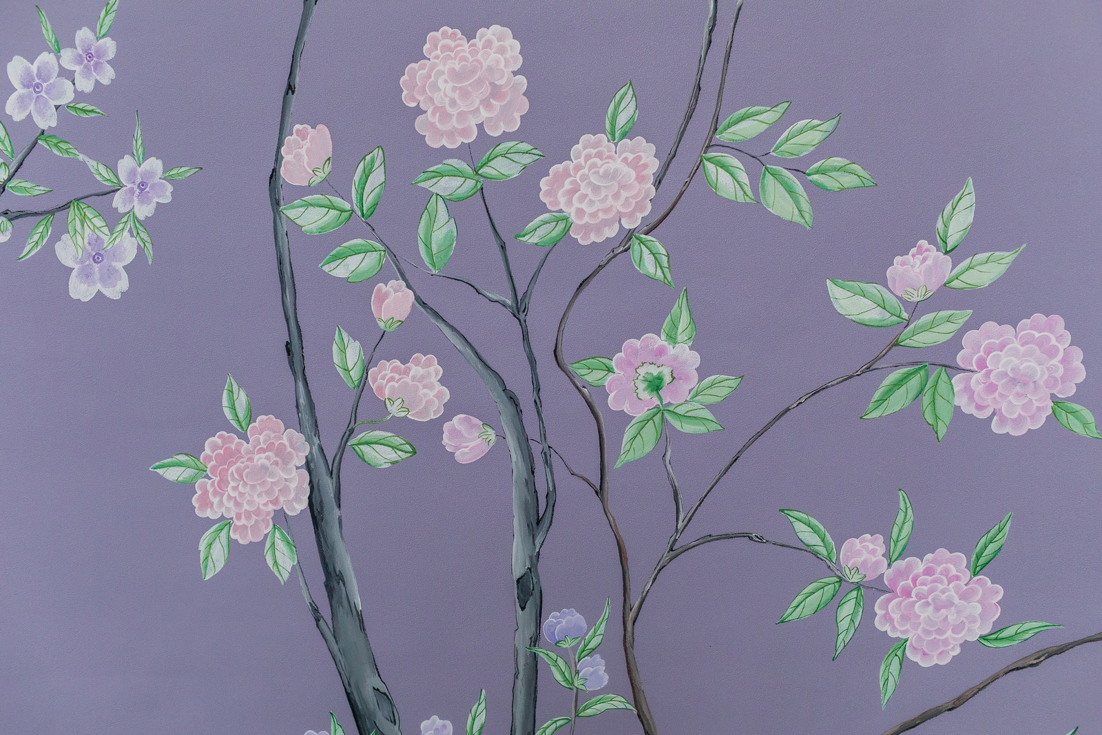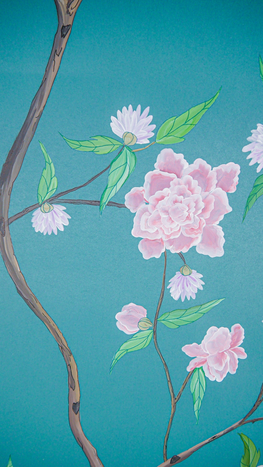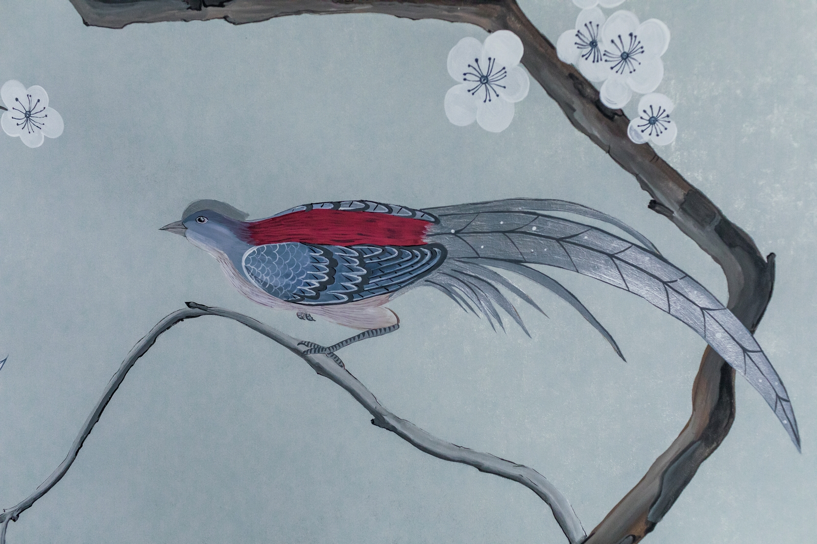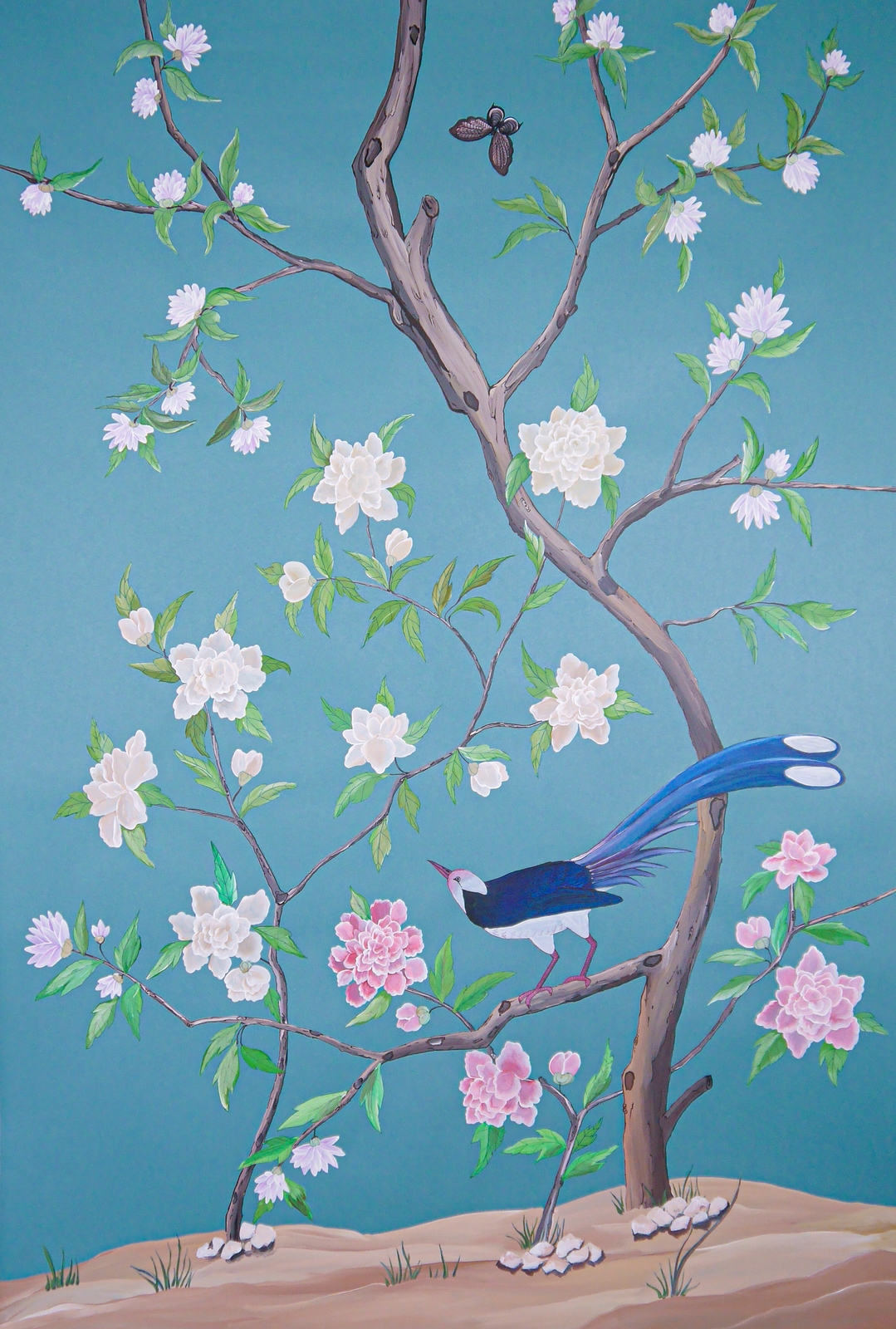 Pfauen in Granatapfelbäumen, inspiriert von einem Original aus der Qing Dynastie. Das Paneel-Set besteht aus drei Paneelen, das Tapeten-Set aus vier Tapetenstreifen.
