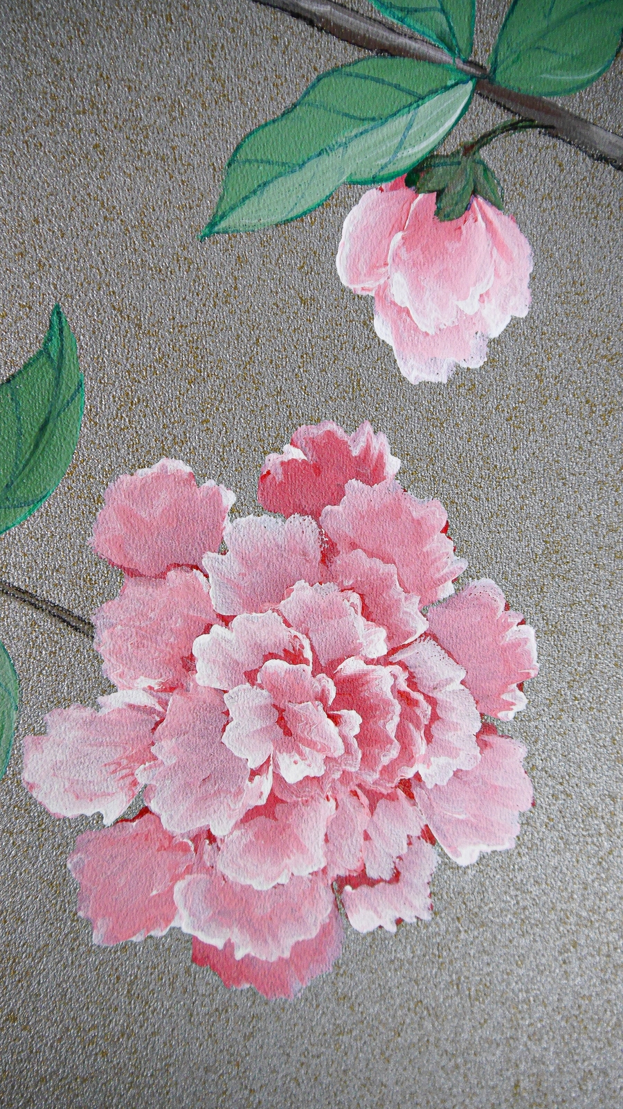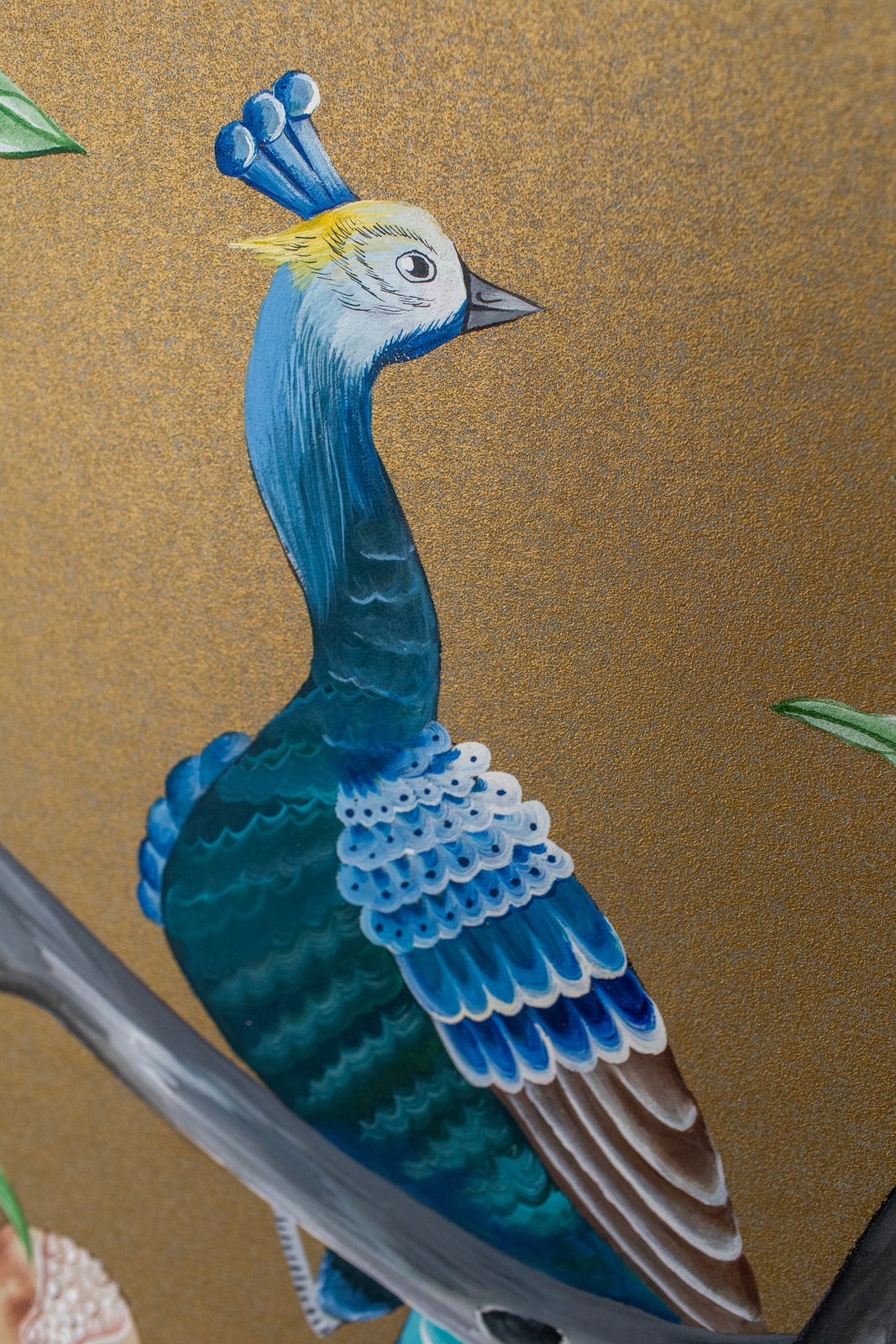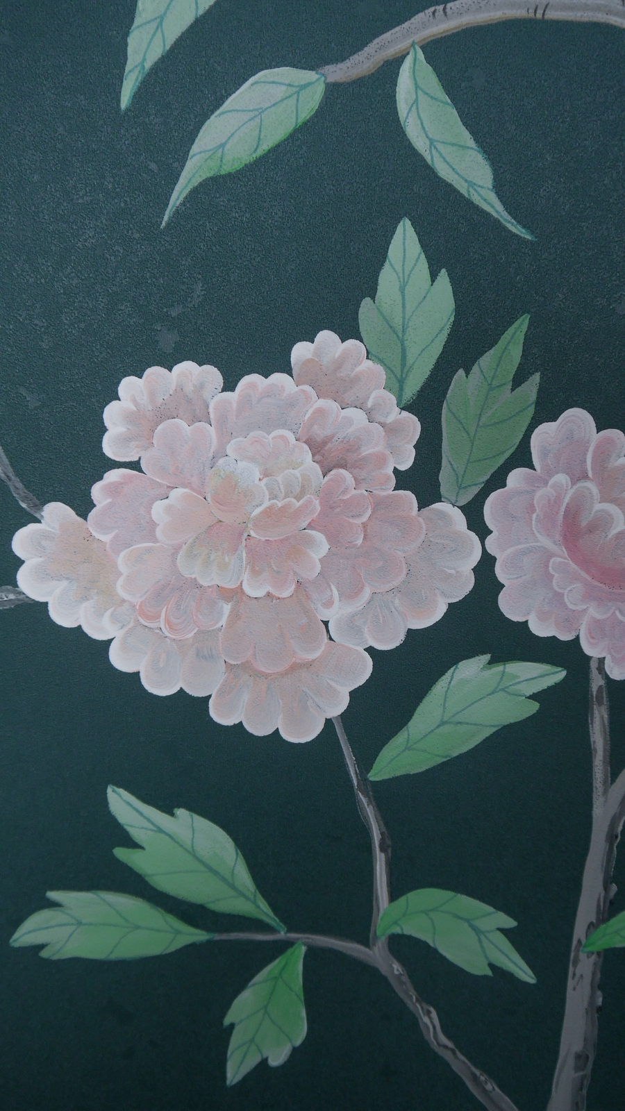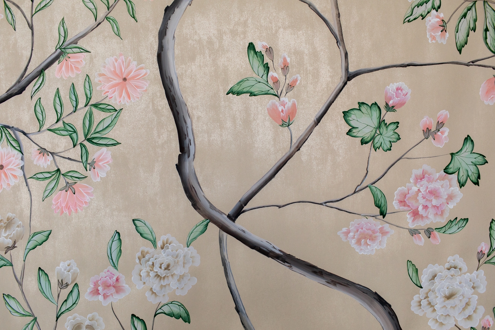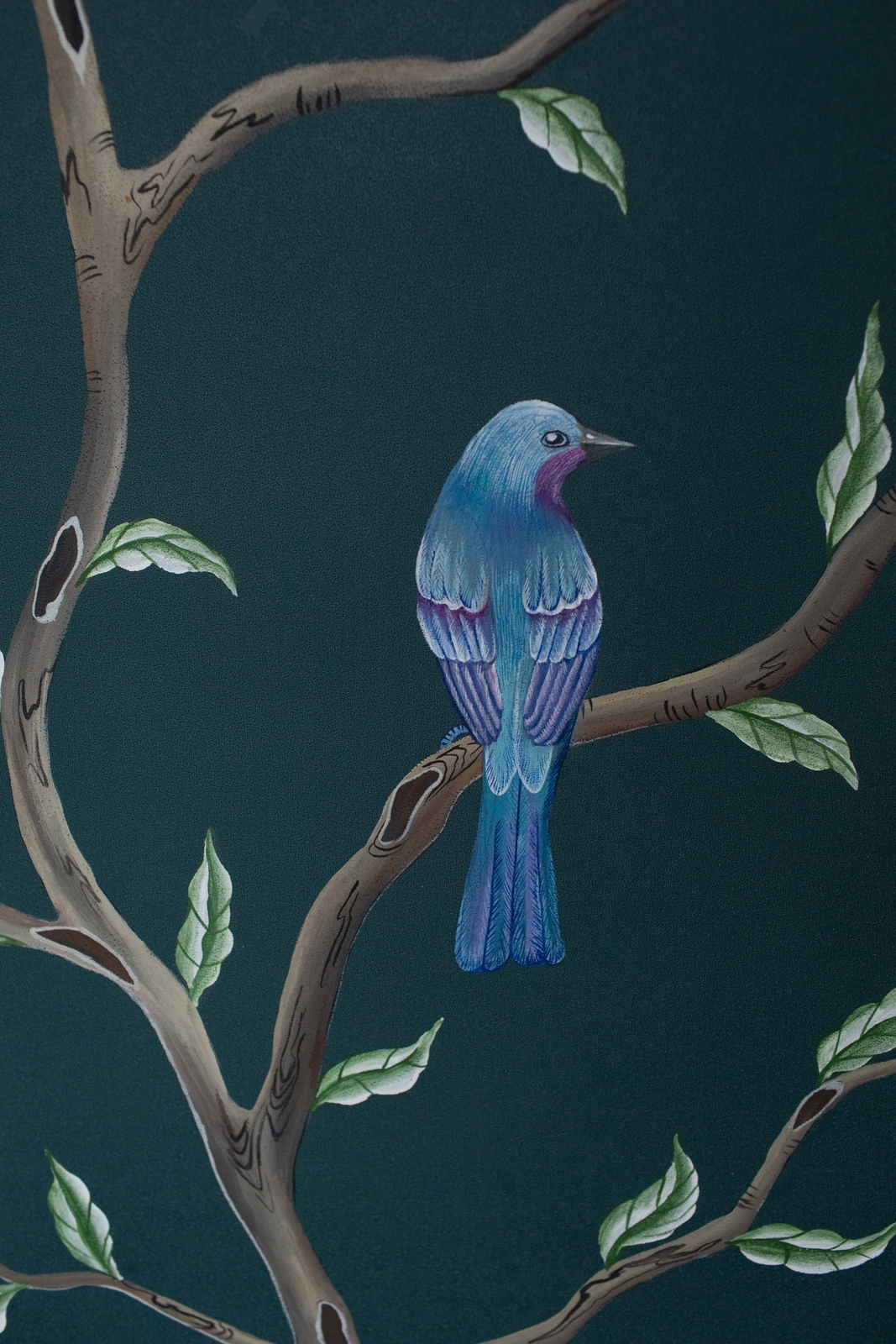 Pfauen in Granatapfelbäumen, inspiriert von einem Original aus der Qing Dynastie. Das Paneel-Set besteht aus drei Paneelen, das Tapeten-Set aus vier Tapetenstreifen.