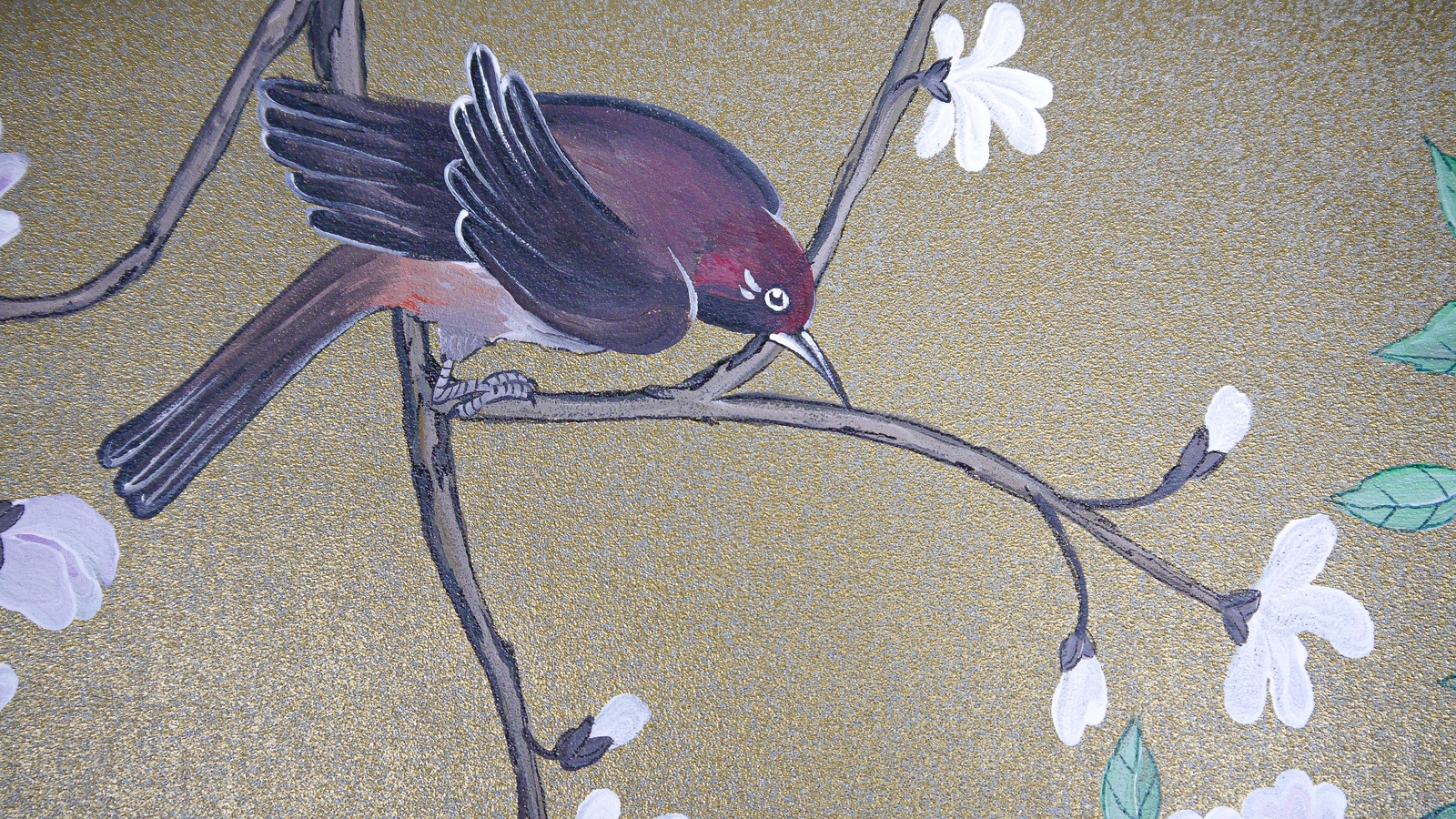 Bambus und exotische Vögel auf rotgoldenem Background, mit Elementen aus Caledon.